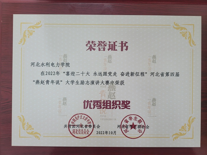 近日,由共青团河北省委员会、河北省学生联合会举办的以"喜迎二十大,永远跟党走"为主题的第四届"燕赵青年说"大学生励志演讲大赛圆满结束,在这次大赛中我院荣获“优秀组织奖”。本次活动中,我院学子积极参加,凝饱...