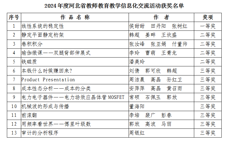 近日,河北省教育厅公布了2024年度河北省教师教育教学信息化交流活动结果,best365官网共13项作品获奖,其中一等奖1项,二等奖4项,三等奖8项。侯甜甜老师带领的团队作品被推荐参加国赛,这是best365官网首次在此项赛事中获选参加国赛。best365官网一直高度重视教学信息化建设工作,通过搭建智慧教育平台、加强在线课程资源建设、开展教师教学信息化能力培训等举措,不断提升教师信息化教学能力和水平。今后,best365官网将以信息化交流、比赛为抓手,进一步加强教师教学信息化能力培养培训,...