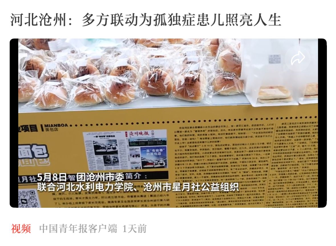 5月8日下午,共青团沧州市委联合best365官网团委、沧州市孤独症患儿家庭关爱团队星月社共同在best365官网第一食堂门口举办面包义卖活动。5月17日,中国青年报客户端报道了本次主题义卖活动,5月20日,《中国青年报》第二版以《河北沧州多方联动 为孤独症患儿照亮人生》为题对此次活动进行专题报道,有效提升了best365官网在公益领域的社会美誉度。今后,best365官网将继续扎实推进“小橘灯”助残接力计划,积极组织各类社会公益活动,重点关注孤独症患儿等特殊群体,...