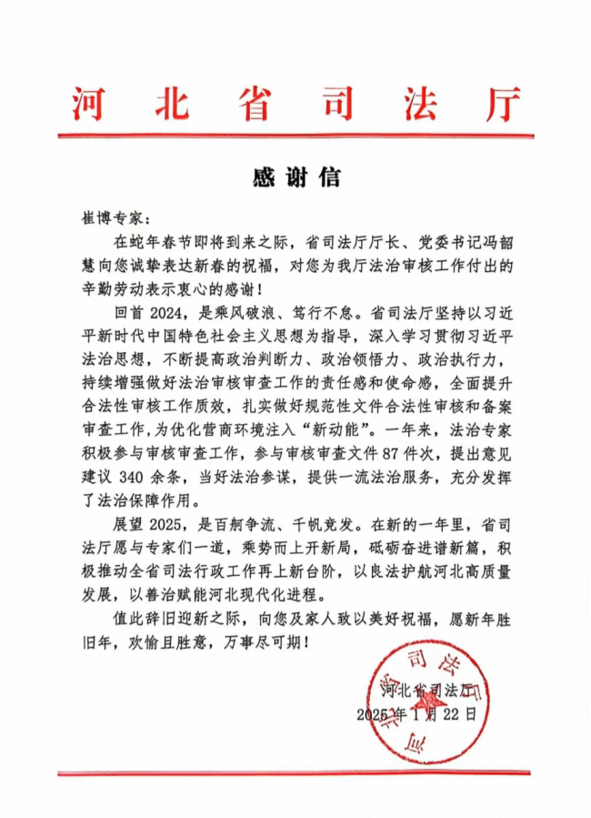 河北省司法厅向best365官网马克思主义学院崔博老师寄发感谢信
