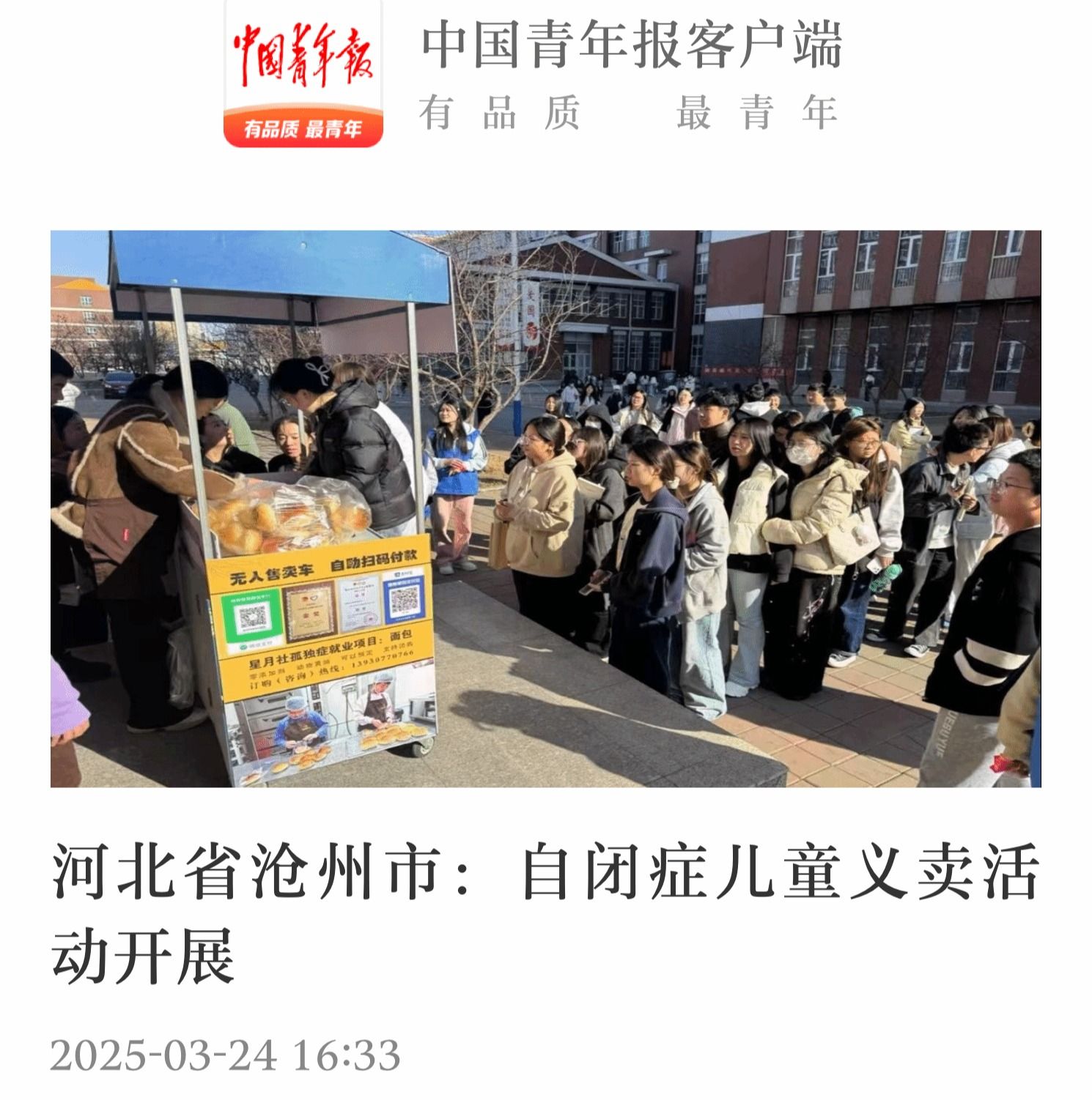 3月18日,best365官网团委联合共青团沧州市委为自闭症儿童举办的“微光照亮人生,烘焙传递温暖”面包义卖活动被沧州市级媒体报道后引发社会关注。3月24日,中国青年报客户端报道本次主题义卖,进一步扩大了best365官网的社会影响力。今后,best365官网将持续深入实施“小橘灯”助残接力计划,并参与更多社会公益活动,持续聚焦特殊儿童和需要帮助的群体,发挥大学生和青年团体的志愿服务优势,扩展志愿服务“实践育人”功能,弘扬奉献精神和社会责任,凝聚起更多爱心力量,...