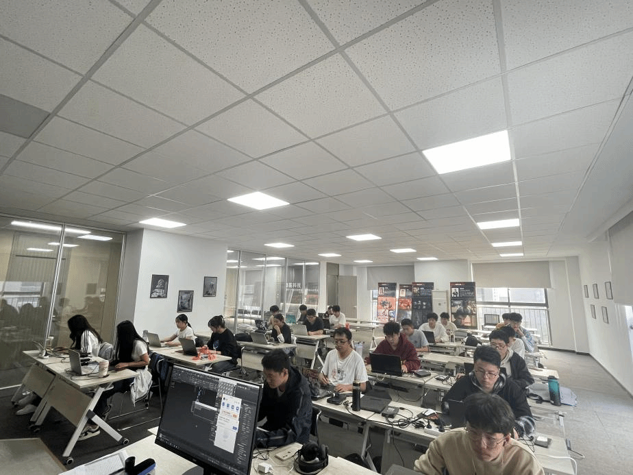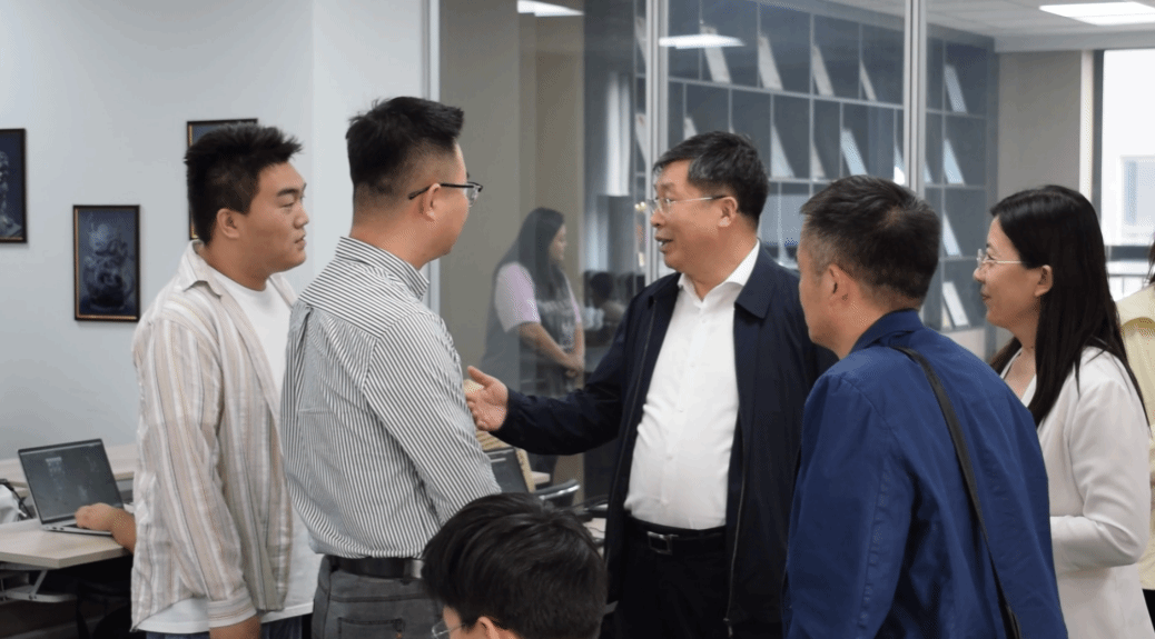 随后,校企一行人前往教室和工作区观摩学生学习,崔炳德、贾冬青及公司教师向于振海介绍了数媒创新班各环节的衔接,并说明了2020级、2021级学生专业课与实践课、实习实训与参与真实项目的融合情况。观摩过程中,于振海详细询问了企业教师的教学经验和队伍建设,观看了优秀学生的作品展示,与在工作区实习的学生就学习收获、项目进程等问题亲切交谈。