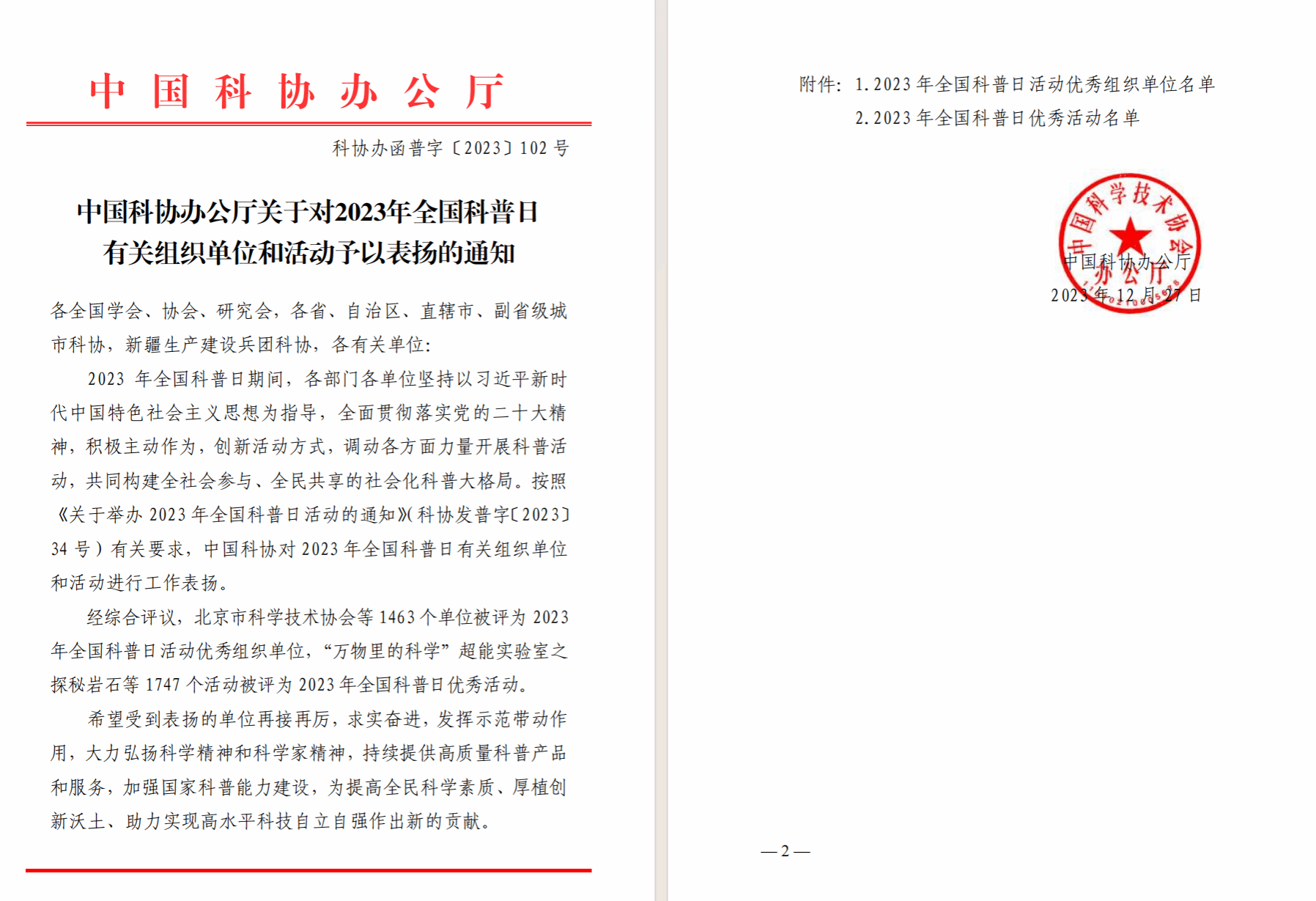 近日,中国科协办公厅发布《关于对2023年全国科普日有关组织单位和活动予以表扬的通知》(科协办函普字〔2023〕102号),对2023年全国科普日有关组织单位和活动进行工作表扬,best365官网榜上有名!