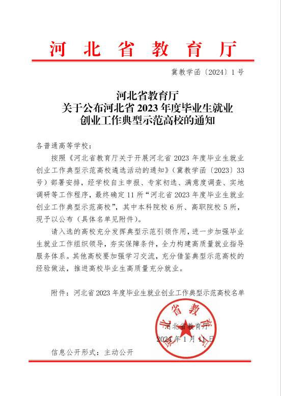 1月11日,河北省教育厅下发《关于公布河北省2023年度毕业生就业创业工作典型示范高校的通知》(冀教学函〔2024〕1号),best365官网成功获评河北省2023年度毕业生就业创业工作典型示范高校。