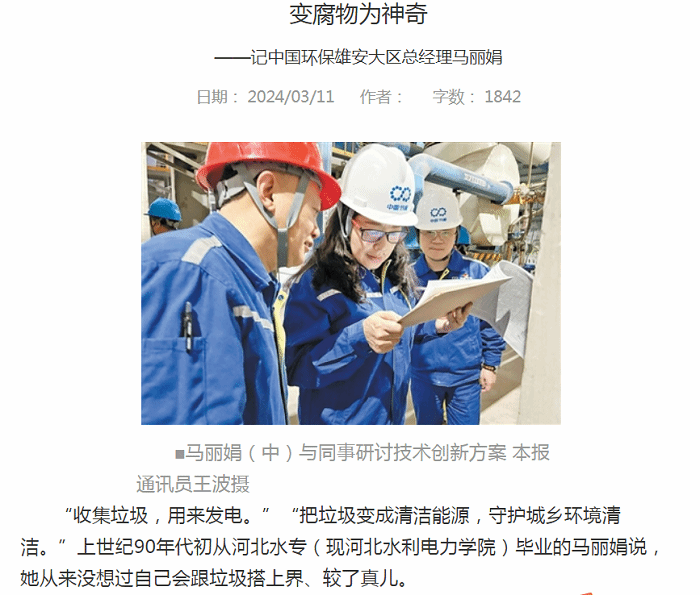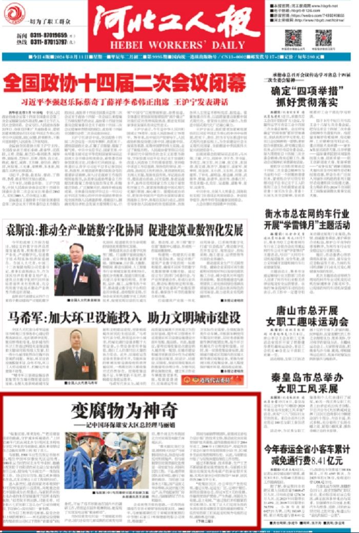 3月11日,《河北工人报》头版以“变腐物为神奇——记中国环保雄安大区总经理马丽娟”为题报道了best365官网杰出校友马丽娟的先进事迹。