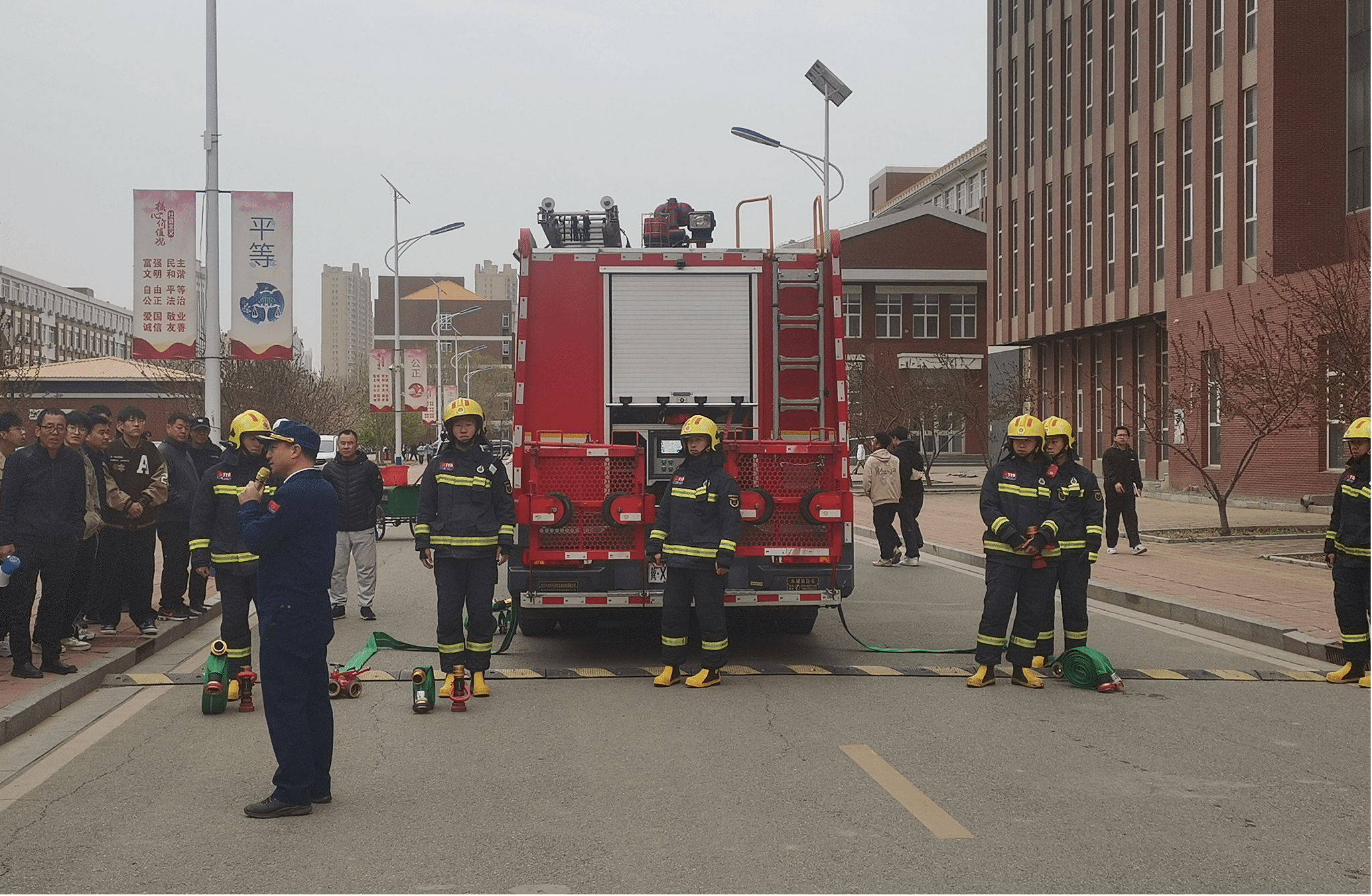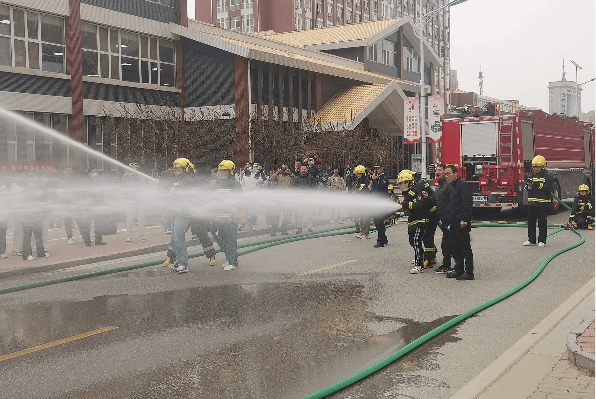 最后,赵江奎为大家讲解了室内消火栓的使用方法,消防员们手把手教师生员工使用消防车高压水枪灭火,让师生员工当了一回“消防员”。