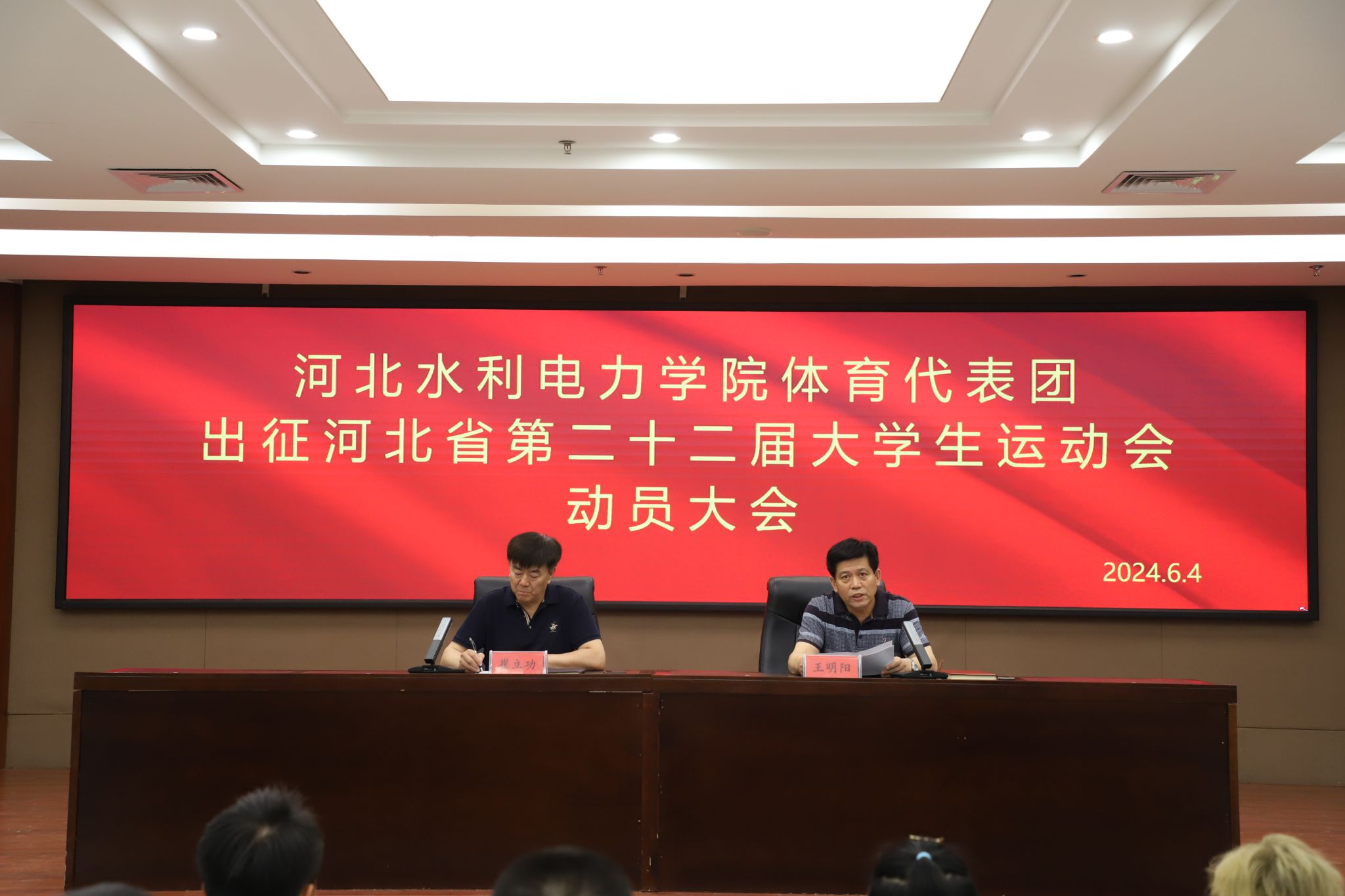 6月4日下午,best365官网体育代表团出征河北省第二十二届大学生运动会动员大会在弘文守正楼9楼报告厅举行,副校长崔立功及全体参赛教练员、运动员、工作人员及部分教师代表参加会议。体育教学部主任王明阳主持会议。