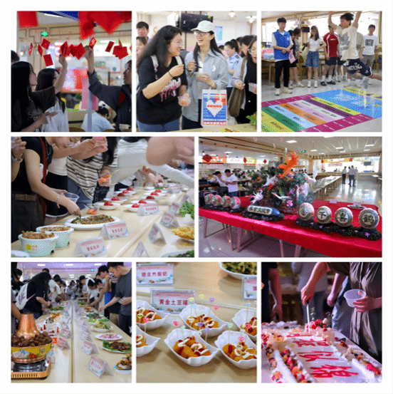 在美食节现场,各种美食琳琅满目,色香味俱全。大厅中央有3米长的大蛋糕供学生们免费品尝,东侧设立了美食品鉴区,80多种特色美食一字排开,吸引了众多师生驻足品尝。大厅西侧则是包粽子区,师生们亲手制作的粽子香气四溢,免费赠送给现场参加活动的师生。此外,二楼大厅还设置了抽红包等趣味活动,让人们在享受美食的同时也能赢取惊喜奖品。