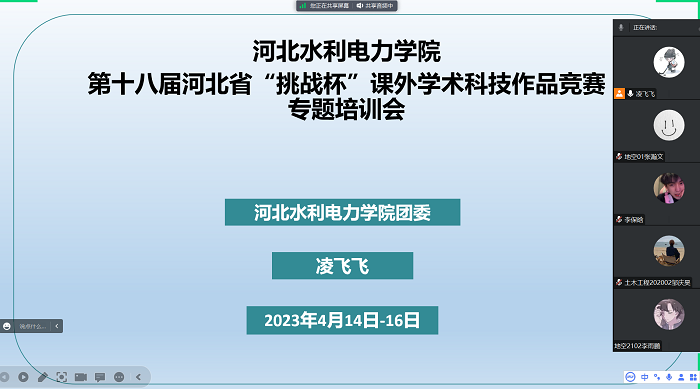 为提高best365官网创新育人质量,培养学生科技创新意识,进一步优化“挑战杯”课外学术科技作品竞赛方案,为师生提供专业指导,提升师生参赛能力,学院团委于4月14日—16日开展了为期三天的河北省“挑战杯”课外学术科技作品竞赛专题线上培训会。本次培训会由校团委兼职副书记凌飞飞主持,共有300余人次师生参加。