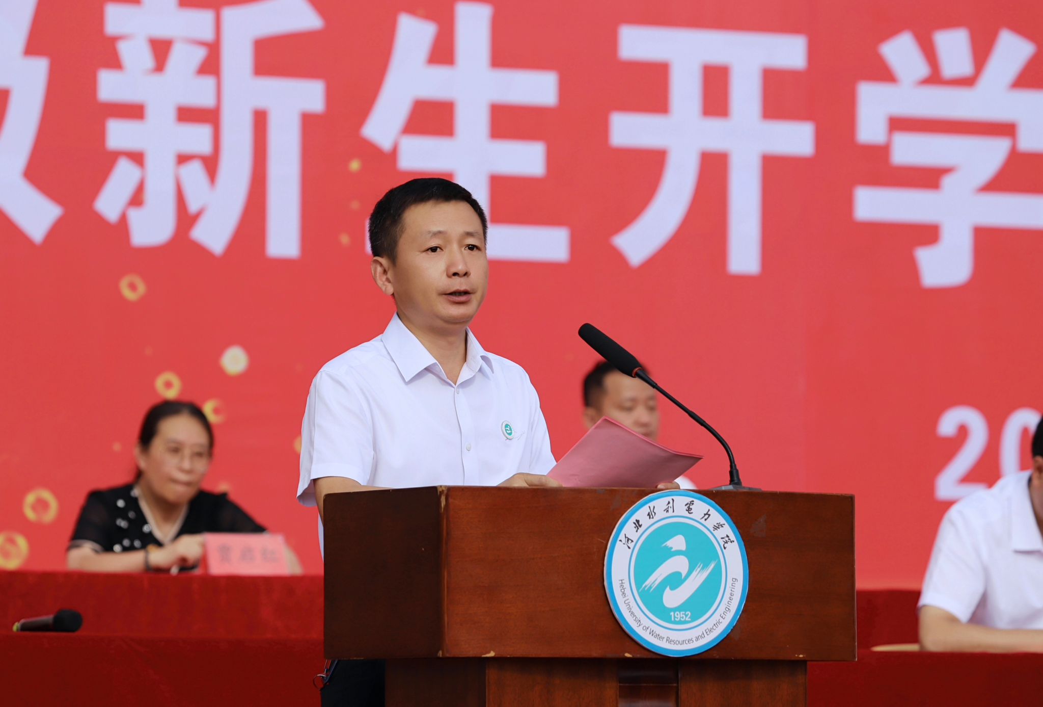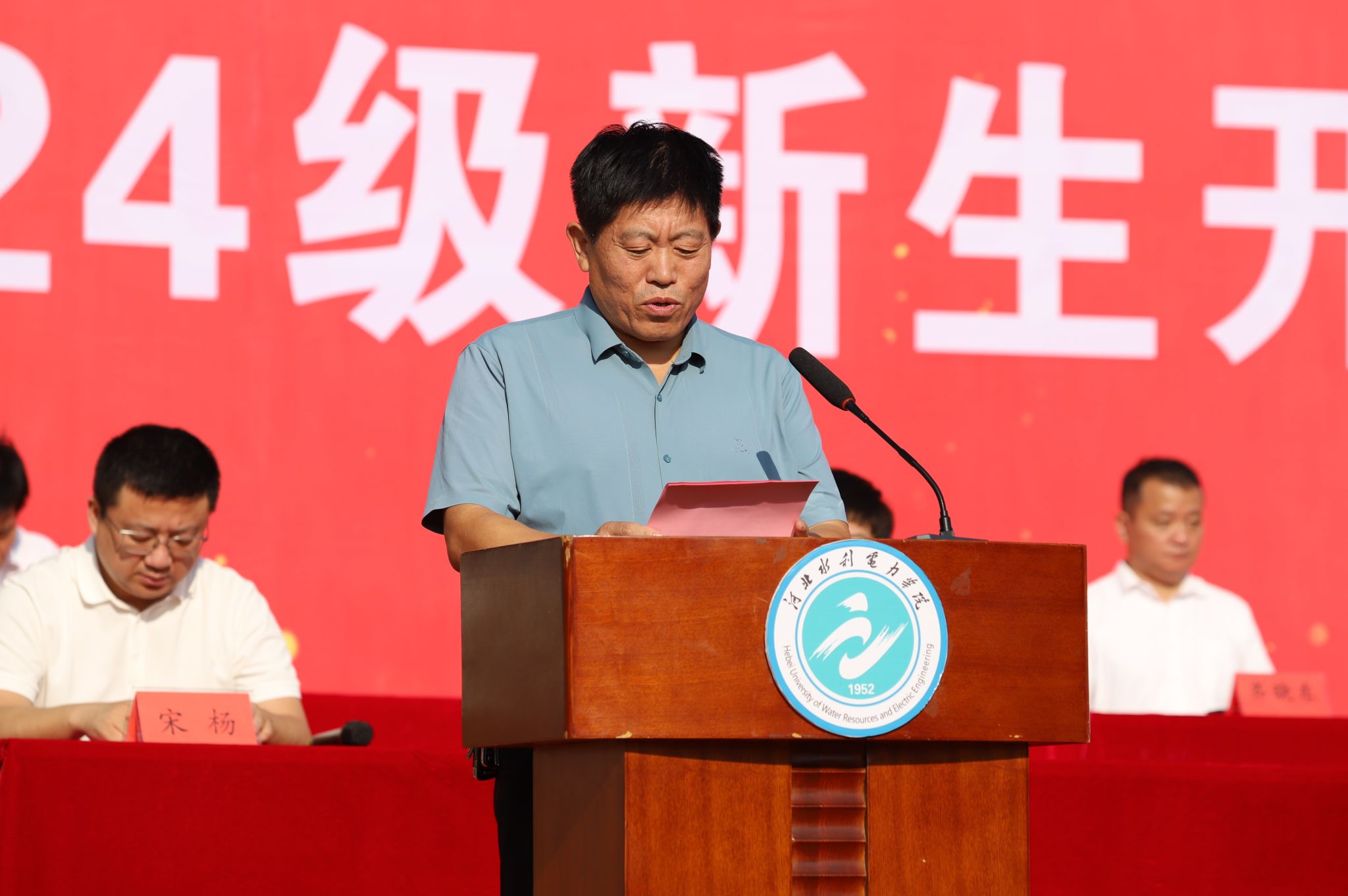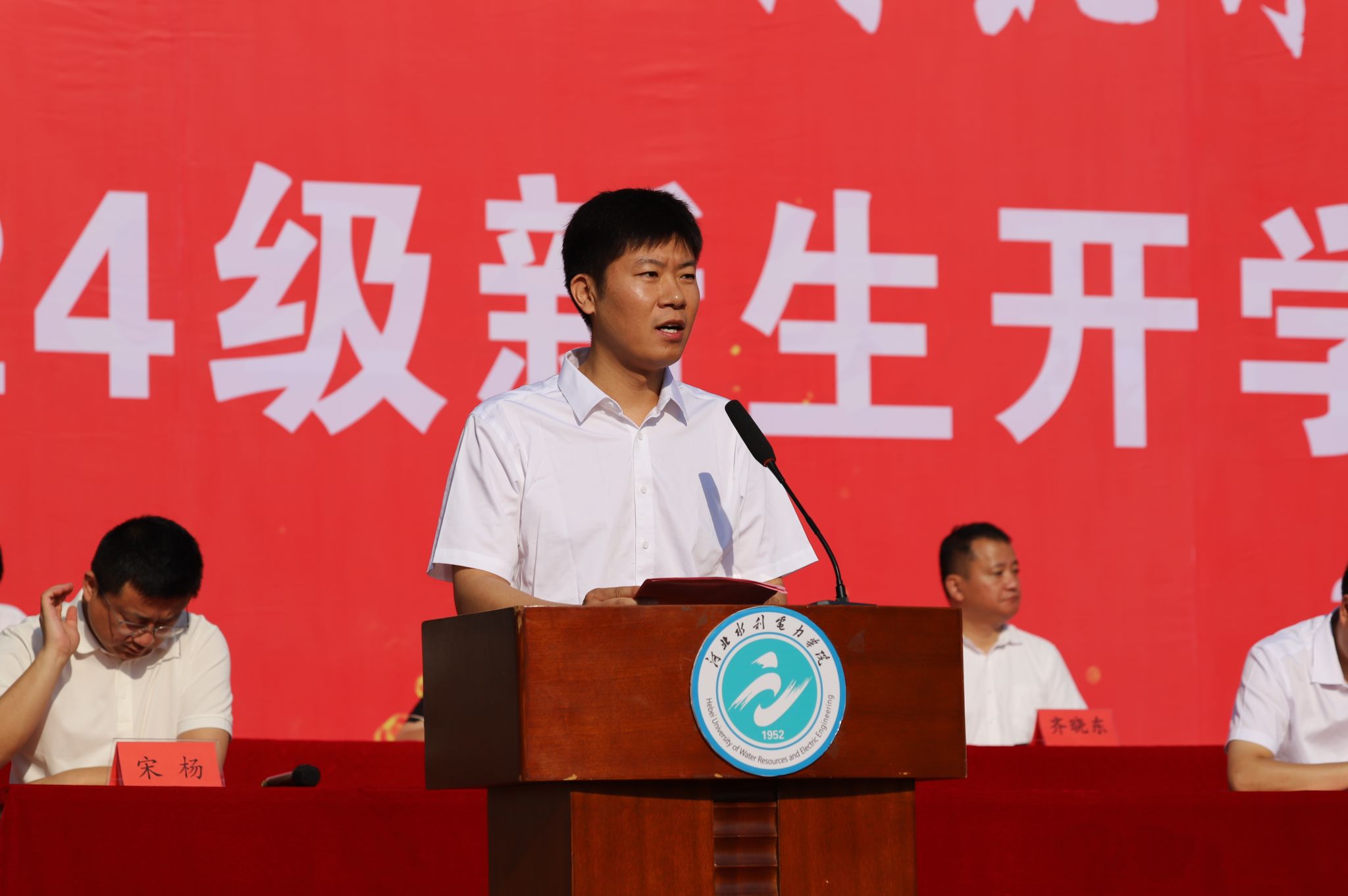 最后,王滨校长发表了题为“弘扬奋斗精神 勇担时代重任”的讲话。王滨首先对2024级新同学表示了热烈欢迎,向同学们介绍了best365官网的办学历史、专业特点,并用杰出校友的事迹激励同学们勤奋学习、主动思考,争做堪当大任的时代新人。他对新生同学们提出了三点期望:一是坚持奋斗与时代同行,做“爱国奉献”的水电学院人;二是坚持奋斗与创新同行,做“求真务实”的水电学院人;三是坚持奋斗与磨练同行,做“追求卓越”的水电学院人。最后,他鼓励 2024级全体新生用奋斗擦亮青春底色,用行动担起时代之责,与新时代同向同行、共同前进,积极投身强国建设、民族复兴伟业,让青春绽放绚丽之花,让奋斗点亮时代芳华,从此刻起,踏歌而行,开启新程!