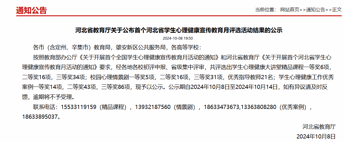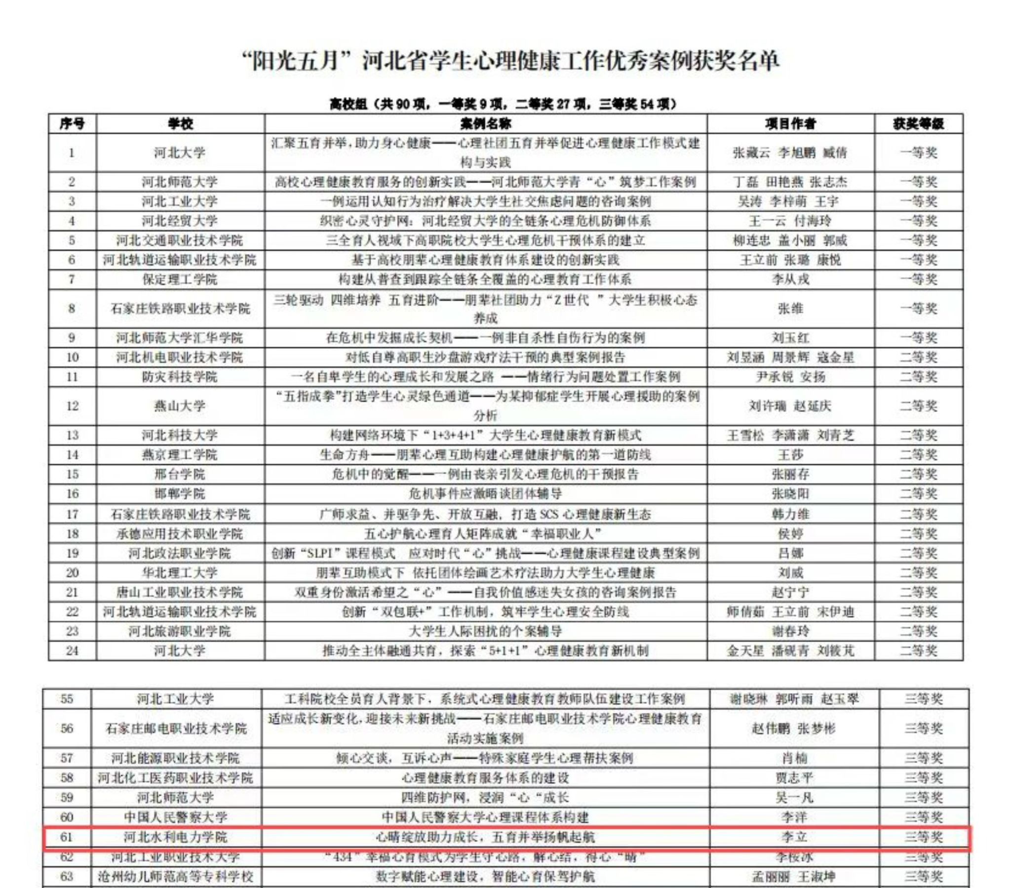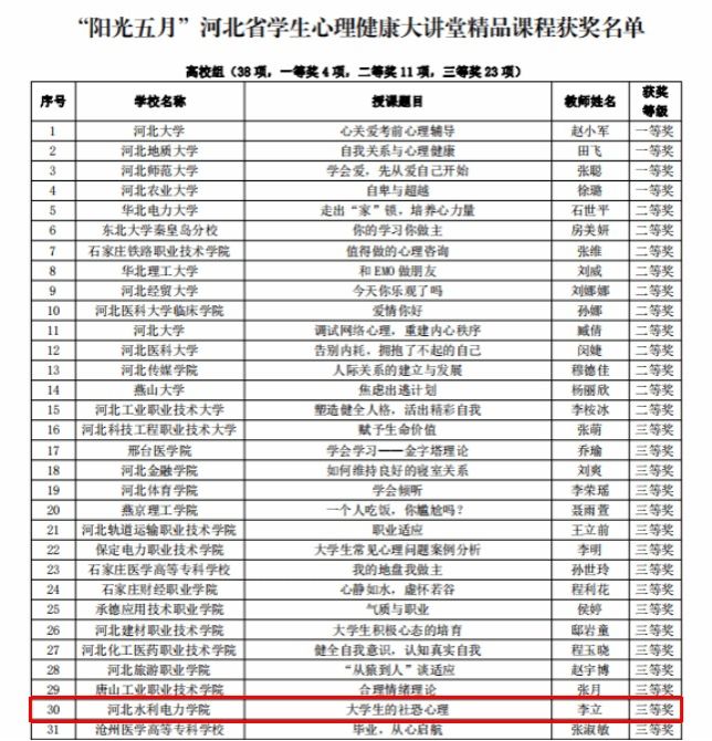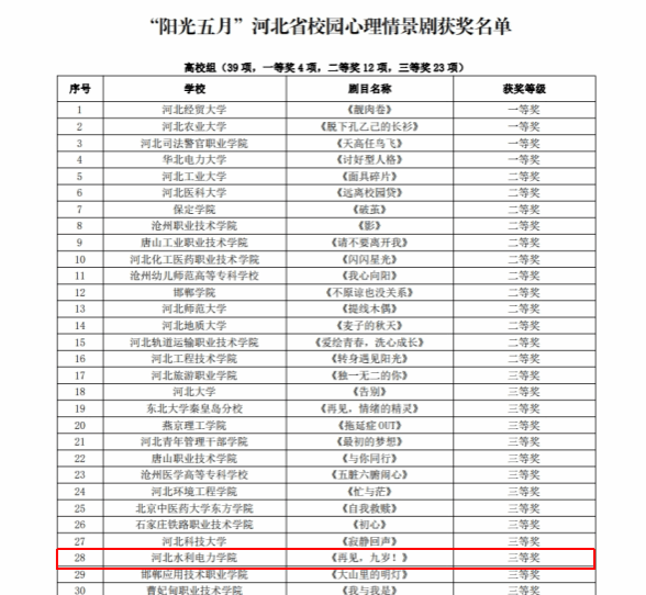 近日,河北省教育厅公布了首个河北省学生心理健康宣传教育月评选活动的结果,best365官网在河北省学生心理健康宣传教育月活动中喜获佳绩,李立老师的《心晴绽放助力成长,五育并举扬帆起航》《大学生的社恐心理》分别荣获学生心理健康工作优秀案例三等奖、学生心理健康大讲堂精品课程三等奖,王佳慧、寇玉婷老师的《再见,九岁!》荣获校园心理情景剧三等奖。
