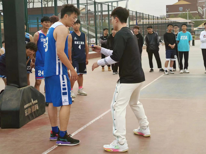 活动开始,李林岳分享了自己的训练和比赛经历。他讲到,“篮球训练就是一个磨练自己的过程,再累、再苦,那都是成长的必经之路。只有经历刻苦的磨炼,才能掌握超越自己的力量!”之后,他详细讲解了篮球比赛中“一对一”防守和协防与补防等技战术理论,并详细讲解动作要领,亲自示范技术动作。在实战中对队员进行战术指导,启发队员的战术意识,纠正队员的固化错误技术动作。队员们认真听讲,非常珍惜这来之不易的学习机会。训练结束后,李林岳与全体队员进行交流互动,对大家在训练中存在的疑惑一解答。