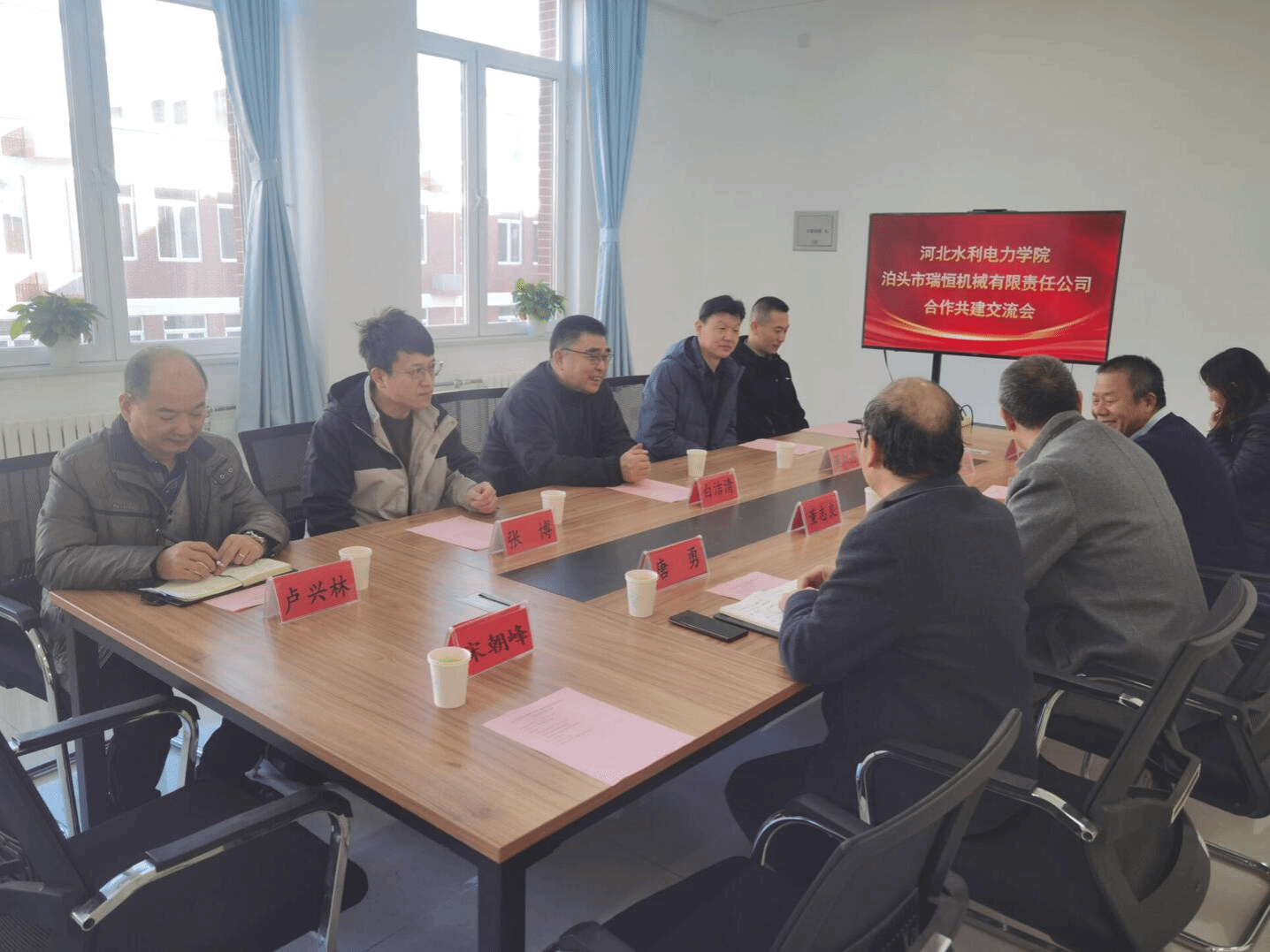 泊头市瑞恒机械有限责任公司副总经理董红昌、生产部经理卢兴林、工艺工程师张博、办公室主任刘瑞祥,best365官网机械工程系主任张铁壁、副主任石岩,继续教育中心主任宋朝峰,电气自动化系主任唐勇参加交流会。
