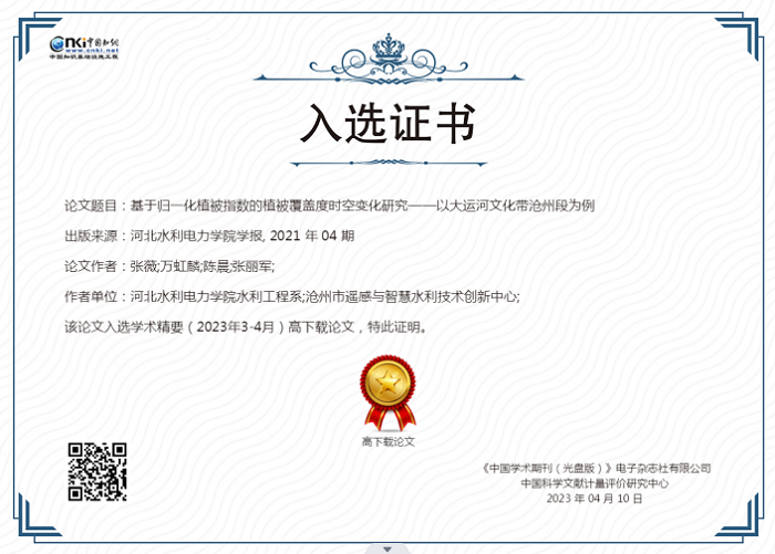 近日,中国知网《学术精要数据库》基于中国知网资源总库,首次发布近12年来高影响力论文榜单,《best365中国官方网站学报》2021年第4期发表的《基于归一化植被指数的植被覆盖度时空变化研究——以大运河文化带沧州段为例》(作者:张薇、万虹麟、陈晨、张丽军)、《人脸识别的智能防疫系统设计》(作者:王继超、张丽娟、尤田、孙东来、回振桥)2篇论文入选。