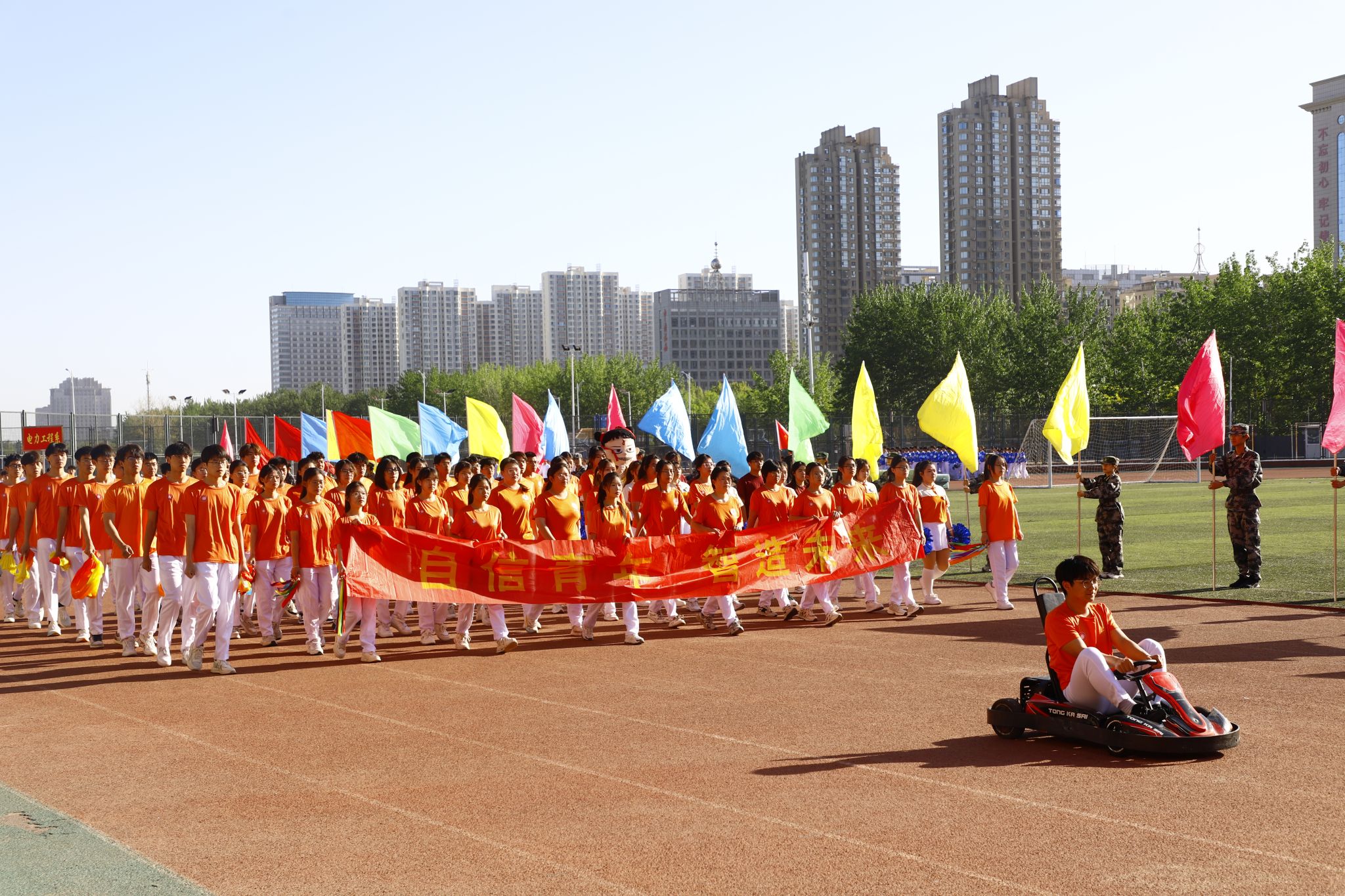 入场式上,伴随着《运动员进行曲》铿锵的旋律,国旗护卫队、旗林队、裁判员方阵及各系代表队依次入场。随后,四百余名同学精彩的文体表演将现场气氛推向高潮。