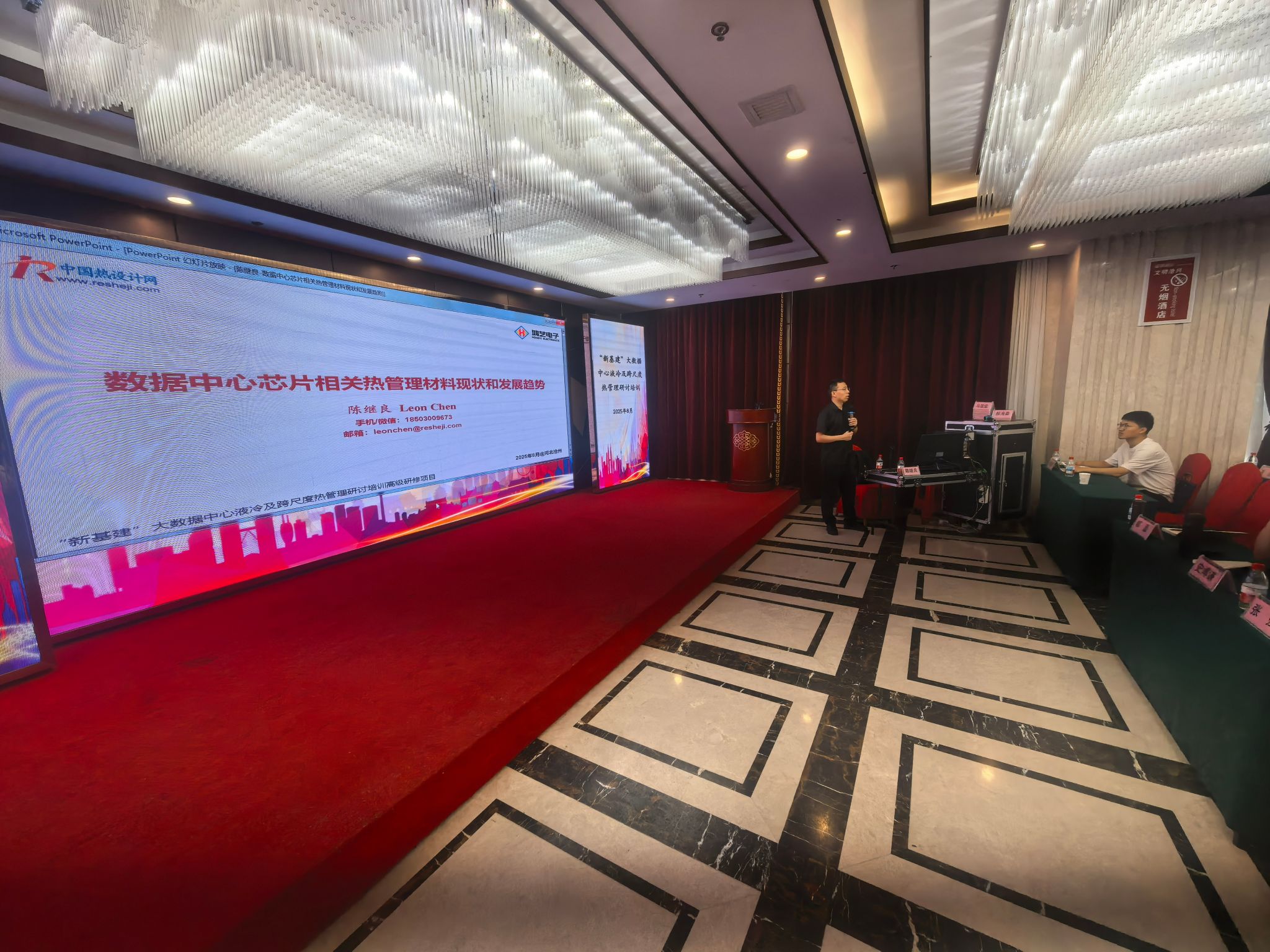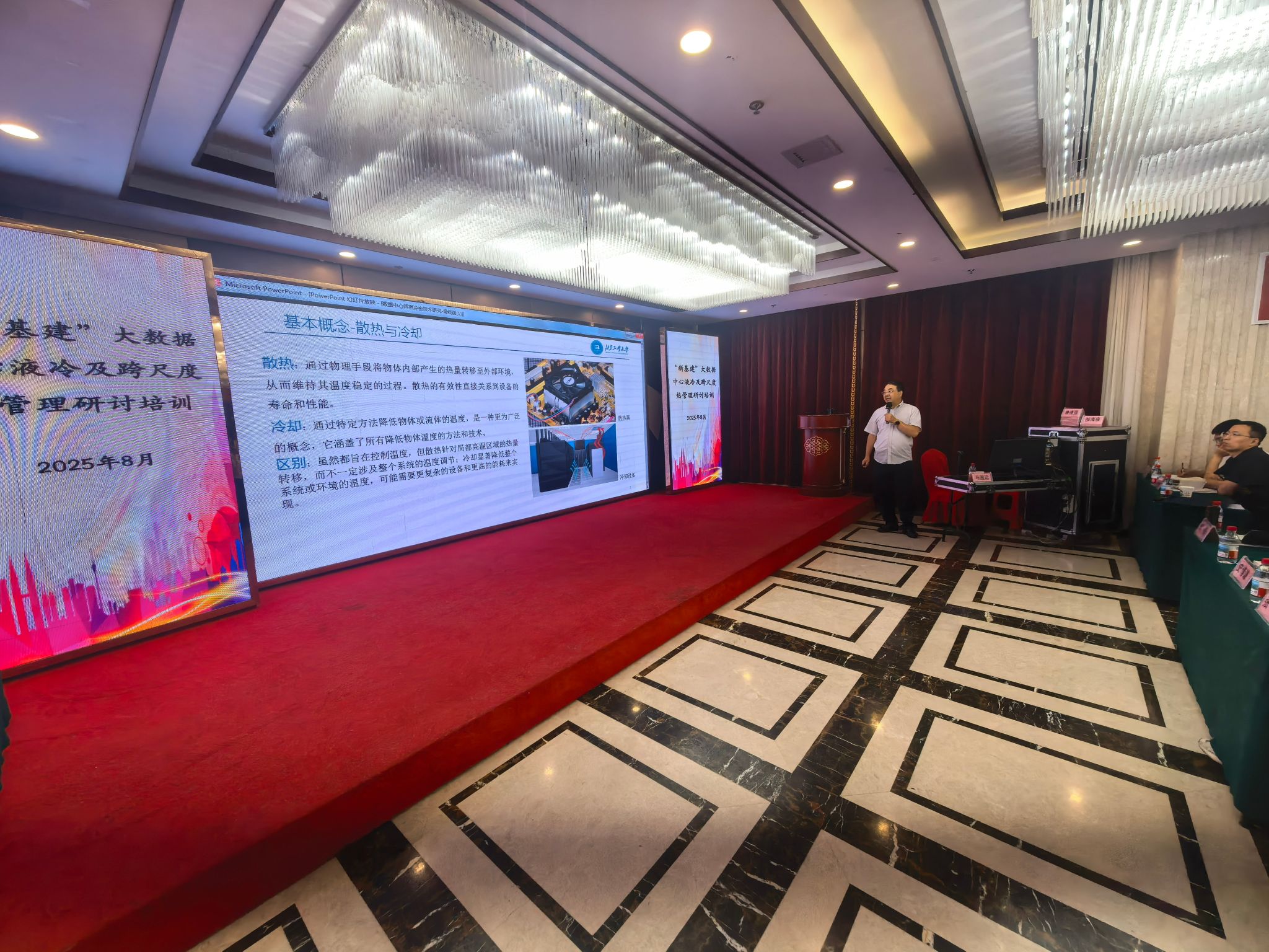 随后,研修课程正式展开。上午,马国远教授作题为《AI智算中心两相冷板及背板冷却技术》的主题报告,从研究背景、技术方案、实验进展、案例分析与未来展望等多个维度展开讲解,内容专业实用,受到学员一致好评。下午,陈继良董事长以《数据中心芯片相关热管理材料现状和发展趋势》为题,结合多年行业实践经验,将理论探讨与企业实际案例相融合,授课深入浅出,帮助学员全面把握行业动态与发展前沿。