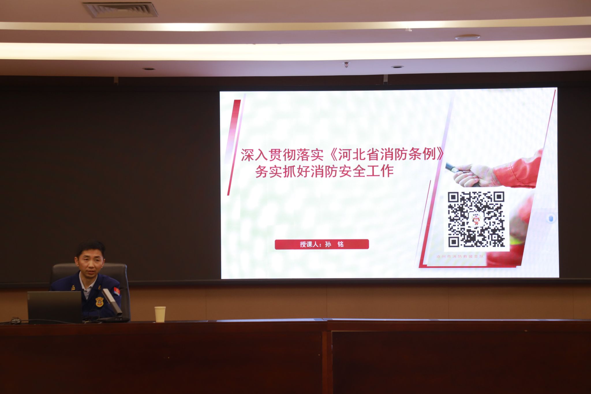 本次培训特邀沧州市消防救援支队新闻宣传科科长孙铭担任主讲。作为沧州市消防安全领域的资深专家,孙铭兼具扎实的专业理论功底与丰富的一线实战经验。培训中,他以应急预案制定为核心牵引,将检查消除火灾隐患、扑救初起火灾、组织人员疏散逃生、开展日常宣传教育等消防安全“四个能力”建设的基础工作有机贯通,结合近年来典型火灾案例,深入剖析事故致因、拆解关键风险点,并针对性提供科学应对策略。整场培训内容紧扣《河北省消防条例》核心要求,既有理论高度的系统阐释,又有实践层面的具体指导,辅以图文并茂的呈现形式,让参训人员深受启发、获益良多,有效强化了全体参训人员的消防安全责任意识与履职尽责能力。