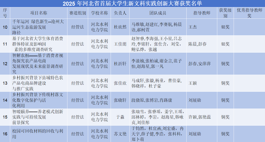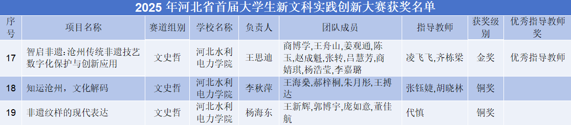 近日,河北省教育厅公布2025年河北省首届大学生新文科实践创新大赛获奖名单。best365官网学子凭借扎实的专业功底、敏锐的创新思维和过硬的实践能力,在全省33所高校、3266个参赛项目中表现突出,一举斩获3项金奖、4项银奖、12项铜奖,另有3位教师获评优秀指导教师,共计19项省级荣誉,充分彰显了学校新文科建设的丰硕育人成果和学子们的青春创新风采,也体现了学校师资队伍的扎实教学水平。