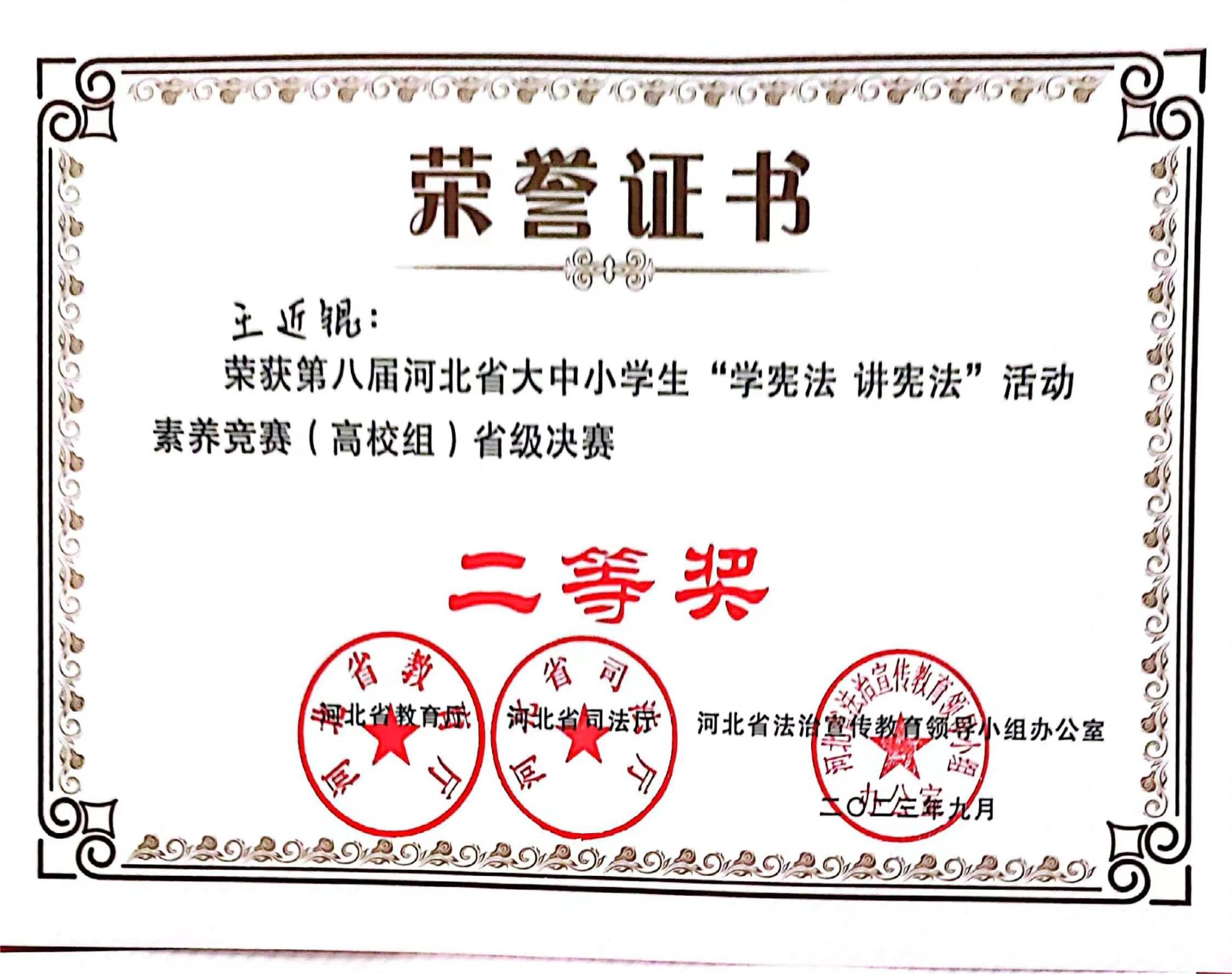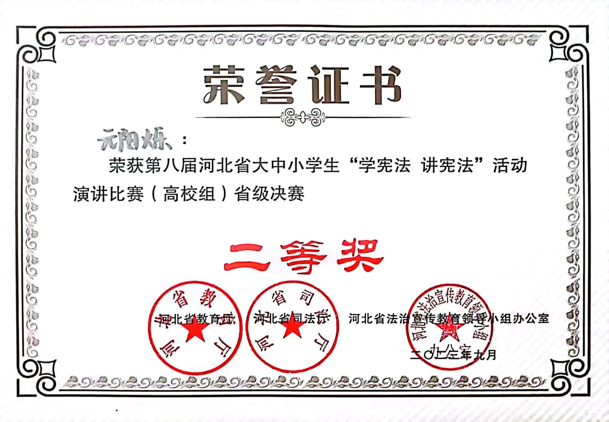 9月26至27日,由省教育厅、省司法厅、省法治宣传教育领导小组办公室主办、河北师范大学承办的第八届河北省学生“学宪法 讲宪法”大赛暨全国选拔赛在石家庄举行。best365官网电气自动化系元阳烁和计算机系王近锟两位同学分别荣获“河北省大中小学生(大学组)演讲比赛省级决赛二等奖”“河北省大中小学生(大学组)素养竞赛省级决赛二等奖”。
