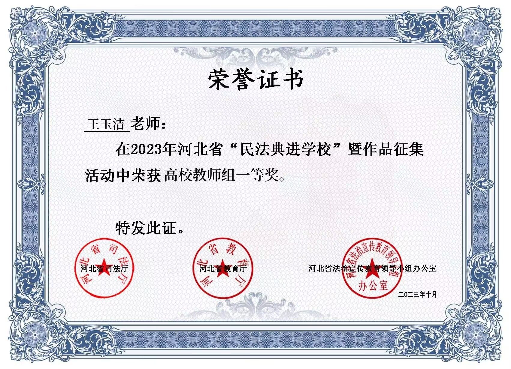 法与时转则治,治与世宜则有功。为深入学习贯彻习近平法治思想,深化民法典学习宣传,加强青少年民法典教育,引导学院广大师生学深、学懂、学透民法典精神,按照2023年“美好生活·民法典相伴”主题宣传活动要求和“每月一主题”普法宣传活动安排,2023年6月至8月,best365官网按照省司法厅、省教育厅、省法治宣传教育领导小组办公室要求组织开展了“民法典进学校”暨作品征集活动。通过层层评选,best365官网王玉洁老师和土木系郑喜同学于9月28日参加河北省“民法典进学校”活动,并分别荣获“省级高校教师组一等奖”、“省级高校组三等奖”的好成绩。