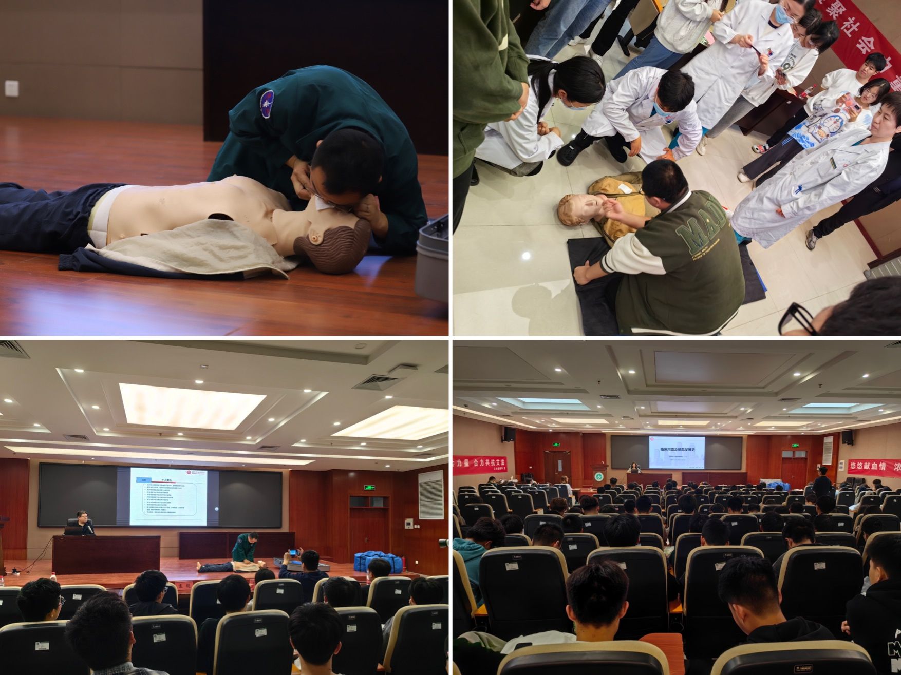 首先,运河区疾控中心于海平主任及其团队为师生讲解了艾滋病防控知识,并为同学们发放性病健康教育知识宣传单。随后,由沧州市人民医院输血科金艳主任做了关于用血献血的相关知识的讲座。通过金主任的讲解让同学们提高了对无偿献血的积极性,更加深入的了解到了无偿献血的意义。最后,由沧州市人民医院急诊科孟舰主任及他的团队,来给大家进行了心肺复苏和海姆雷克急救知识的讲解与实地操作。