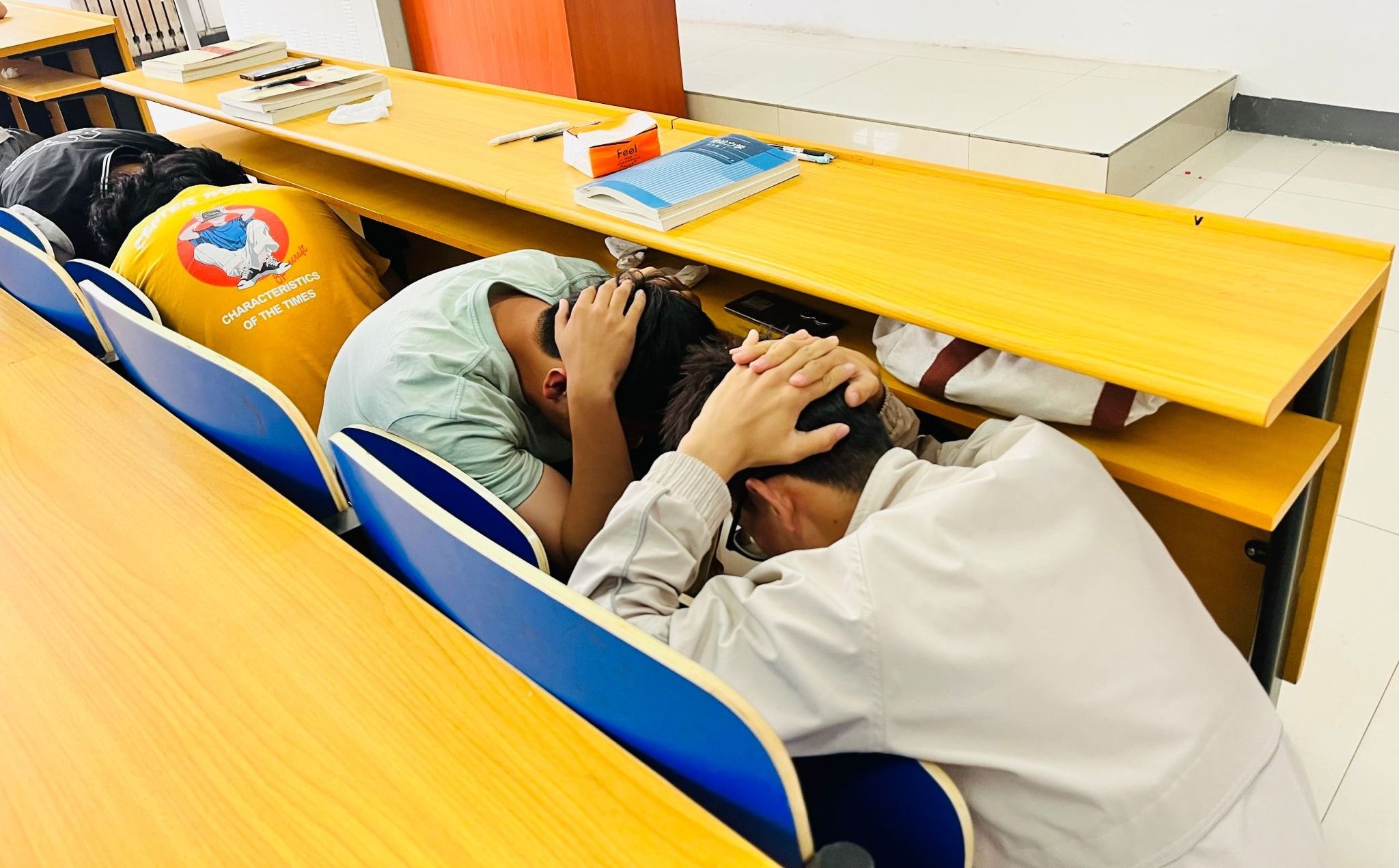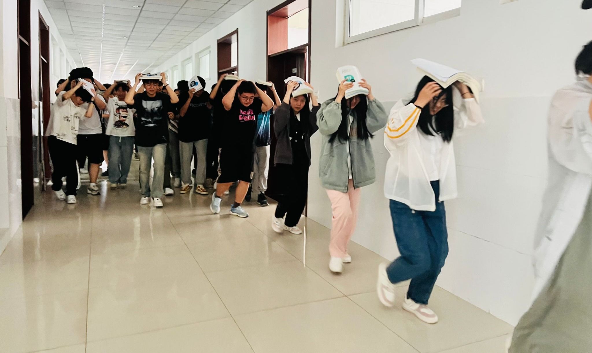 11:50,演练正式开始。校广播台播放警报及紧急避险指令,辅导员、任课老师迅速组织学生进行紧急避险,指导学生双手抱头,找到距离自己最近的安全区域,蹲下抱头,保护好头部。