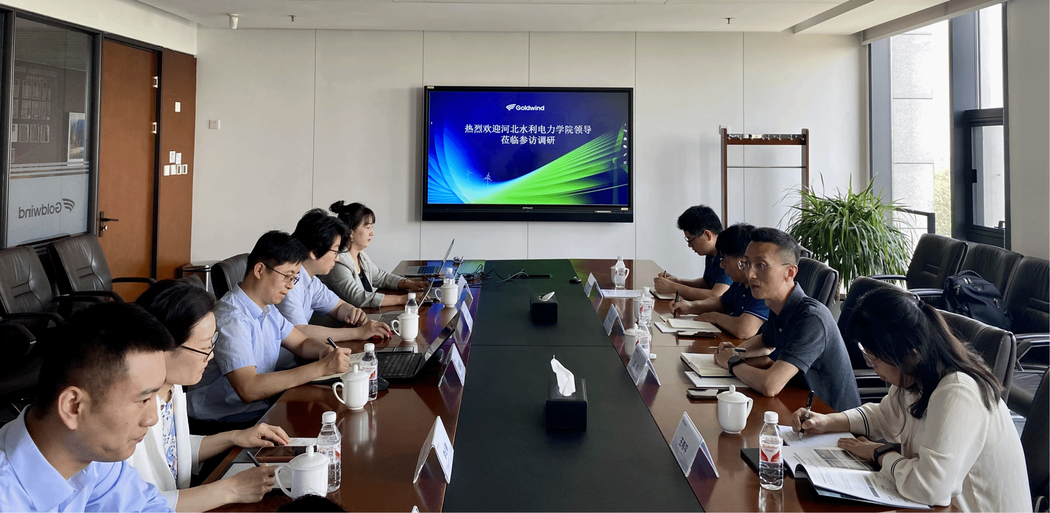 金风科技集团总工办标准化团队负责人甘旭超、技术规划团队主任工程师李心稳、标准化管理主任工程师李伟,金风低碳设计院高级研究员李沐,金风教育校企合作经理李娟、集团人力资源招聘经理李元松、招聘专员宋禹婷出席了交流活动。