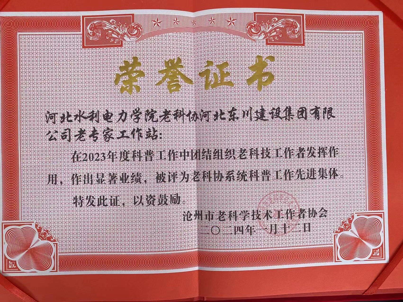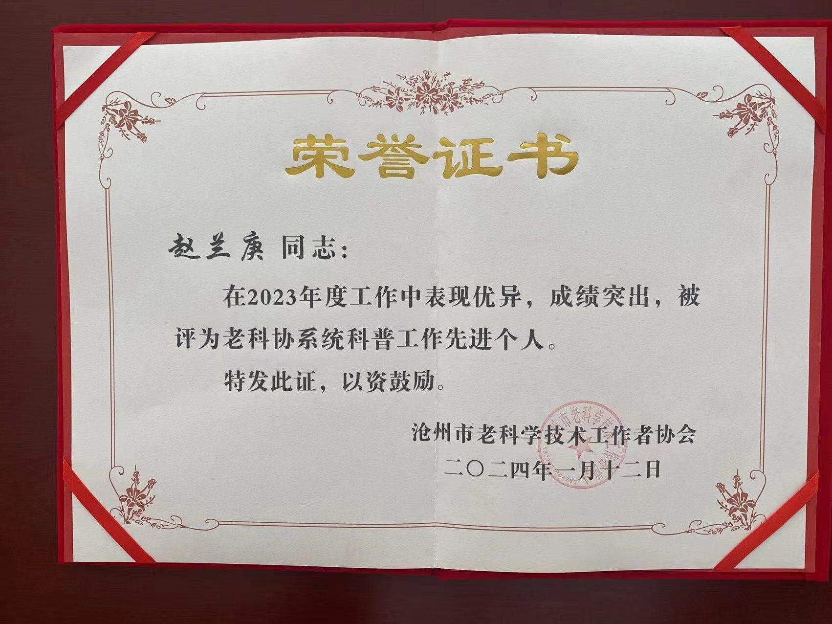 在近日召开的沧州市老科技工作者协会三届六次常务理事会议上,best365官网老科技工作者协会被评为2023年度老科协工作先进集体,赵兰庚同志被评为先进个人。