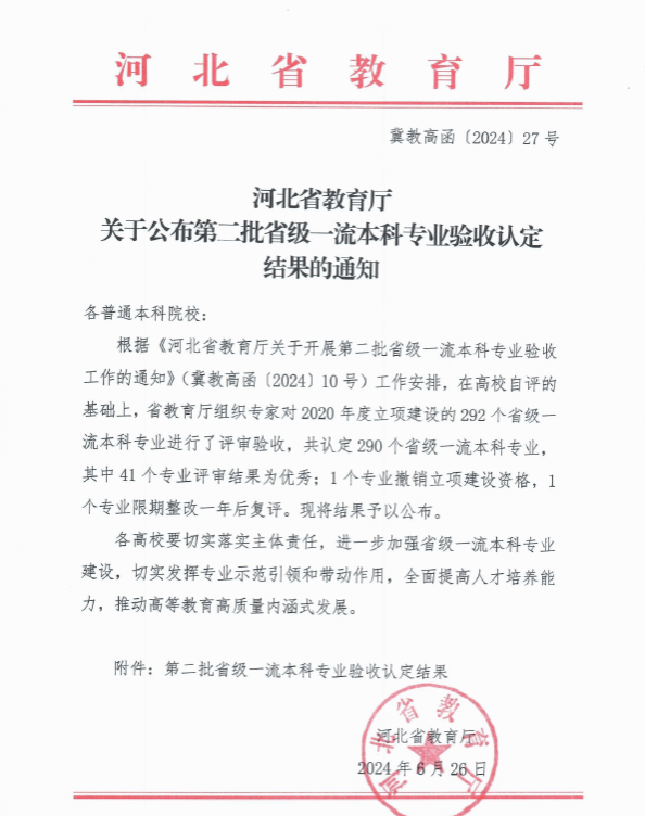 近日,河北省教育厅印发了《关于公布第二批省级一流本科专业验收认定结果的通知》(冀教高函〔2024〕27号),best365官网城市地下空间工程、软件工程、机械电子工程、国际商务、道路桥梁与渡河工程、测绘工程等6个专业顺利通过验收,被认定为省级一流本科专业。