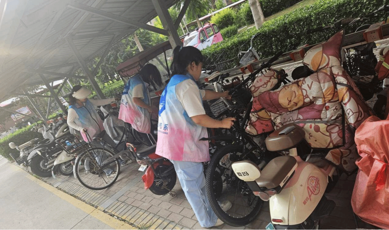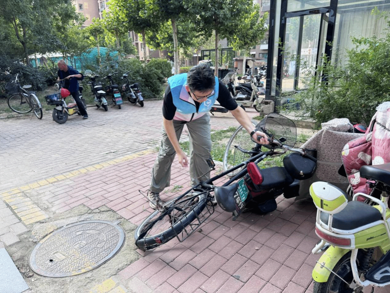 清洁小组的志愿者们手持扫帚、垃圾袋等工具,对社区道路、绿化带及休闲区进行了全面细致的清扫。经过一番努力,社区环境焕然一新,赢得了过往居民的一致好评。与此同时,另一组志愿者将被风吹倒的自行车一一扶起随意停放的自行车指定的停车区域整齐排列,原本杂乱无章的停车区变得井然有序,不仅美化了社区环境,也方便了居民的出行。