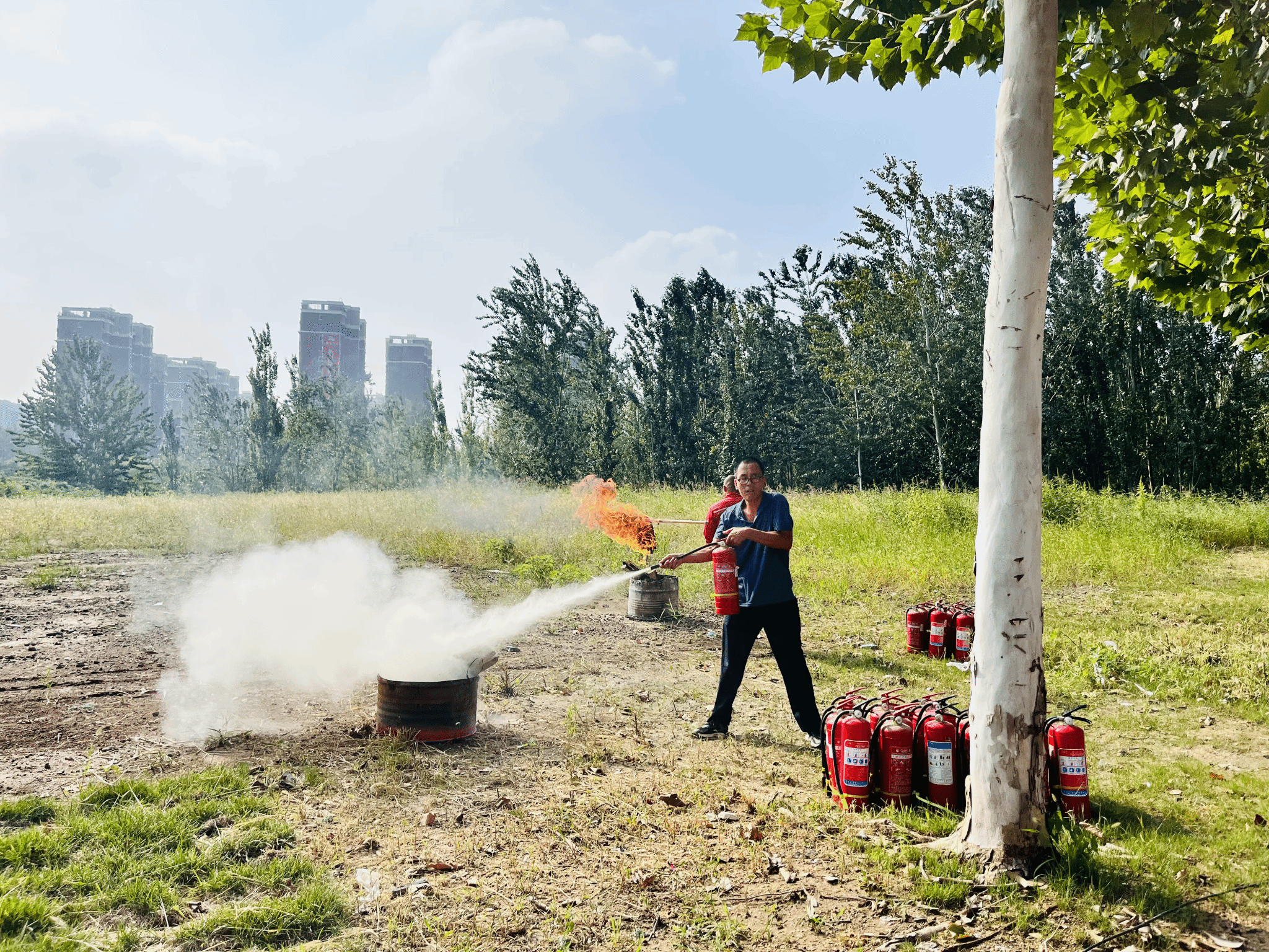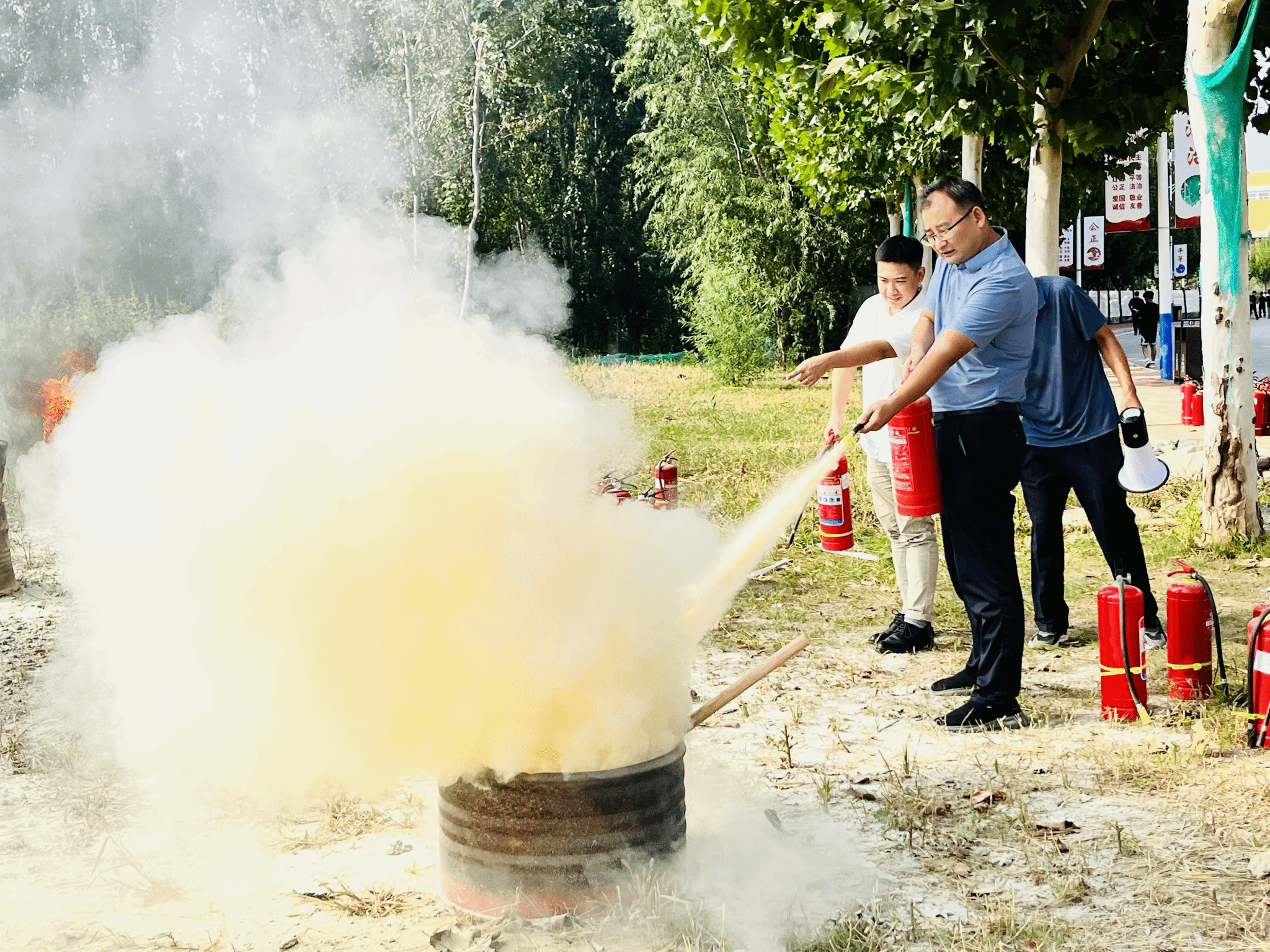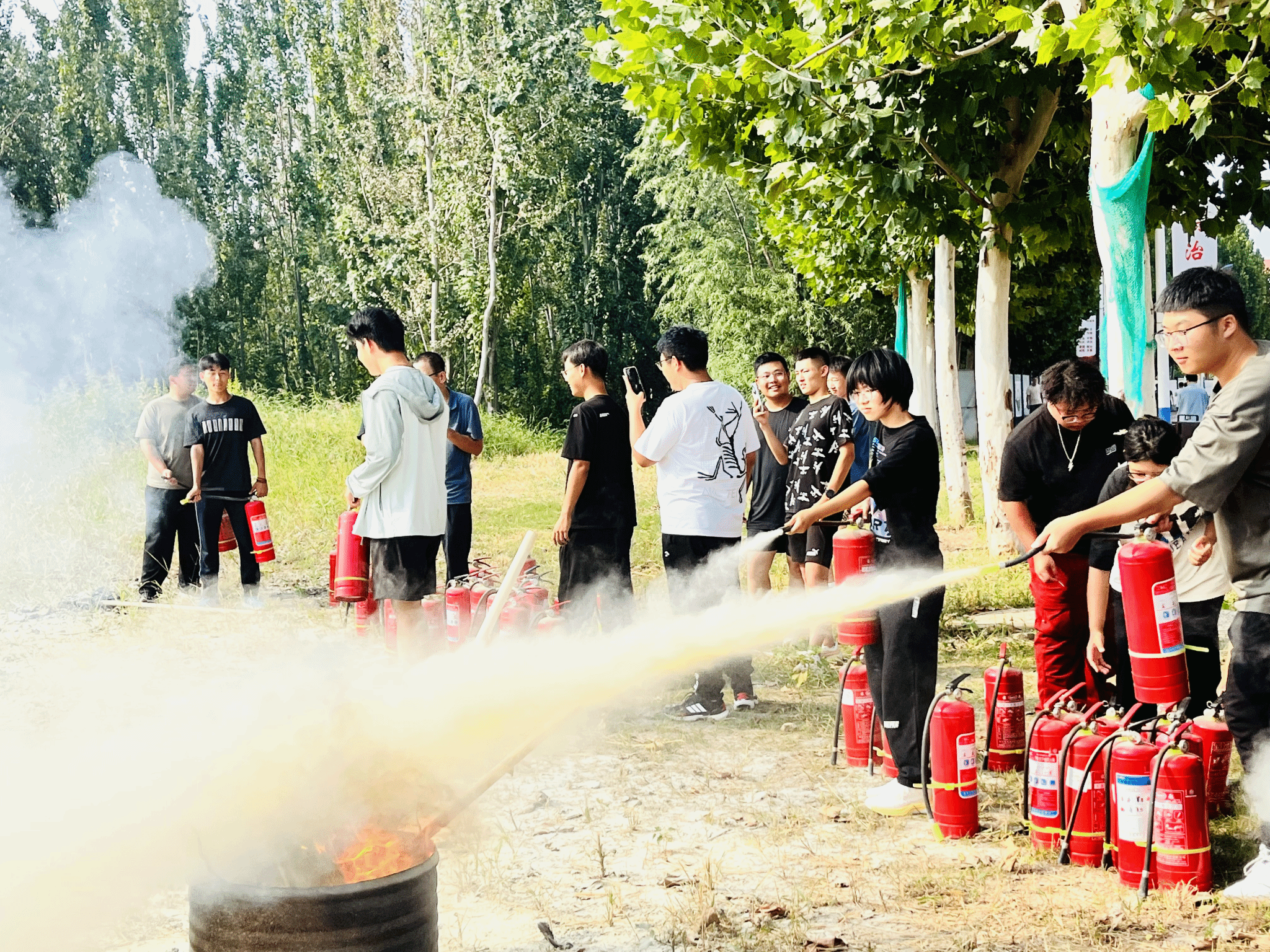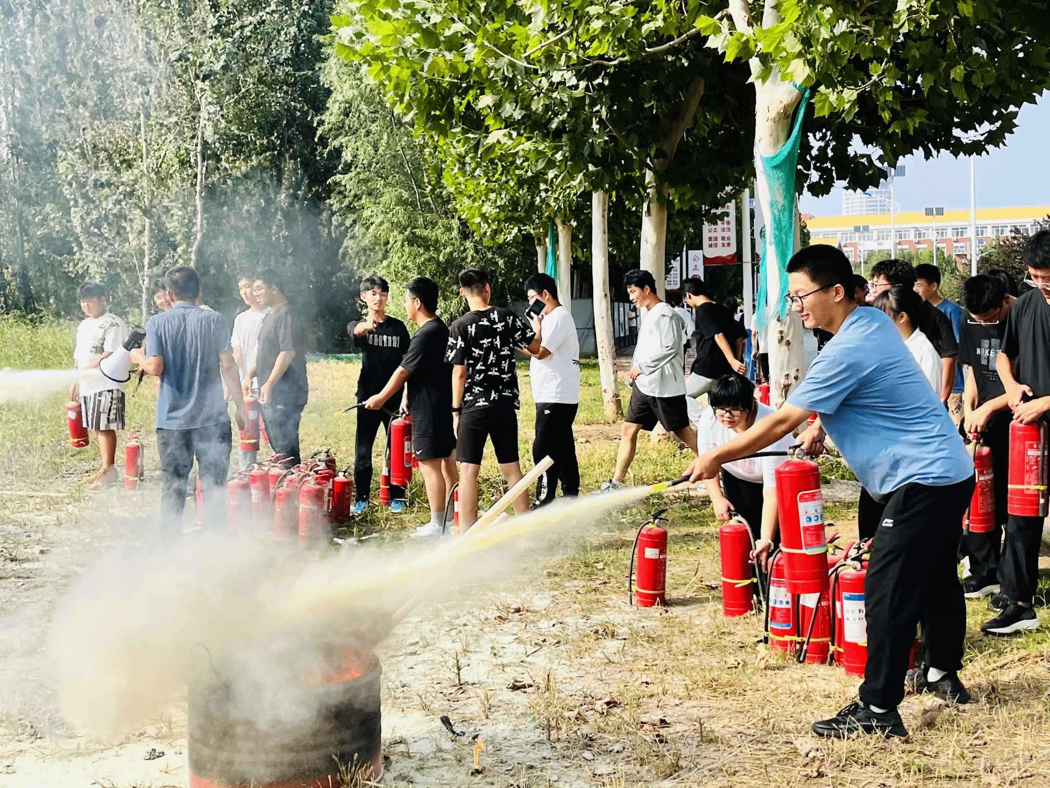随后,罗老师为2024级新生代表及重点岗位职工作了灭火示范。最后在老师们指导下,参加演练人员手持灭火器,依次上前进行实操演练,亲身体验了灭火的过程。