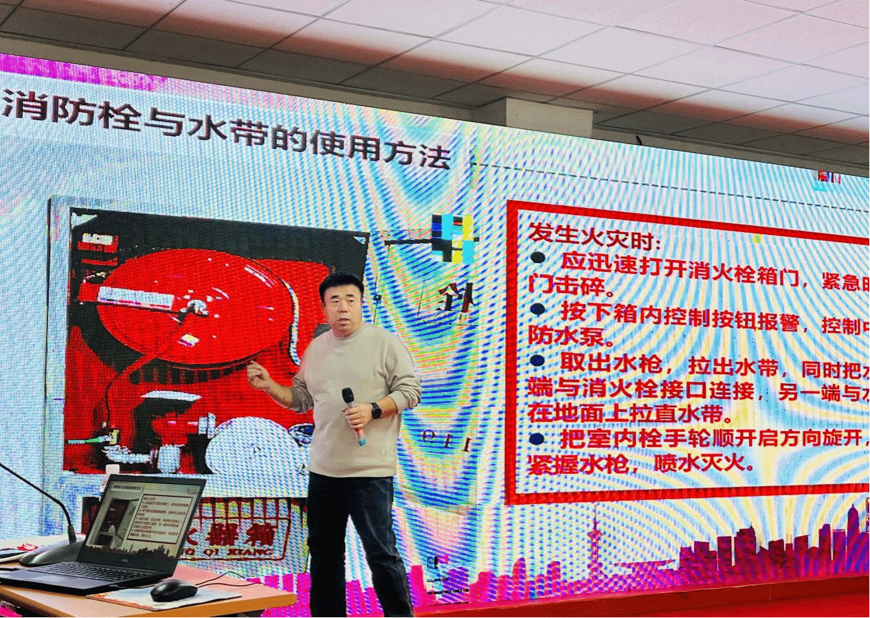 首先,大家共同观看了火灾警示教育宣传片。随后,姚志旺从消防安全法规要求、灭火的基本方法、发生火灾时怎么办、灭火器的使用方法、消防栓与水带的使用方法、救火常识知识、火场人员抢救、火场逃生术等方面为师生做了精彩讲述。