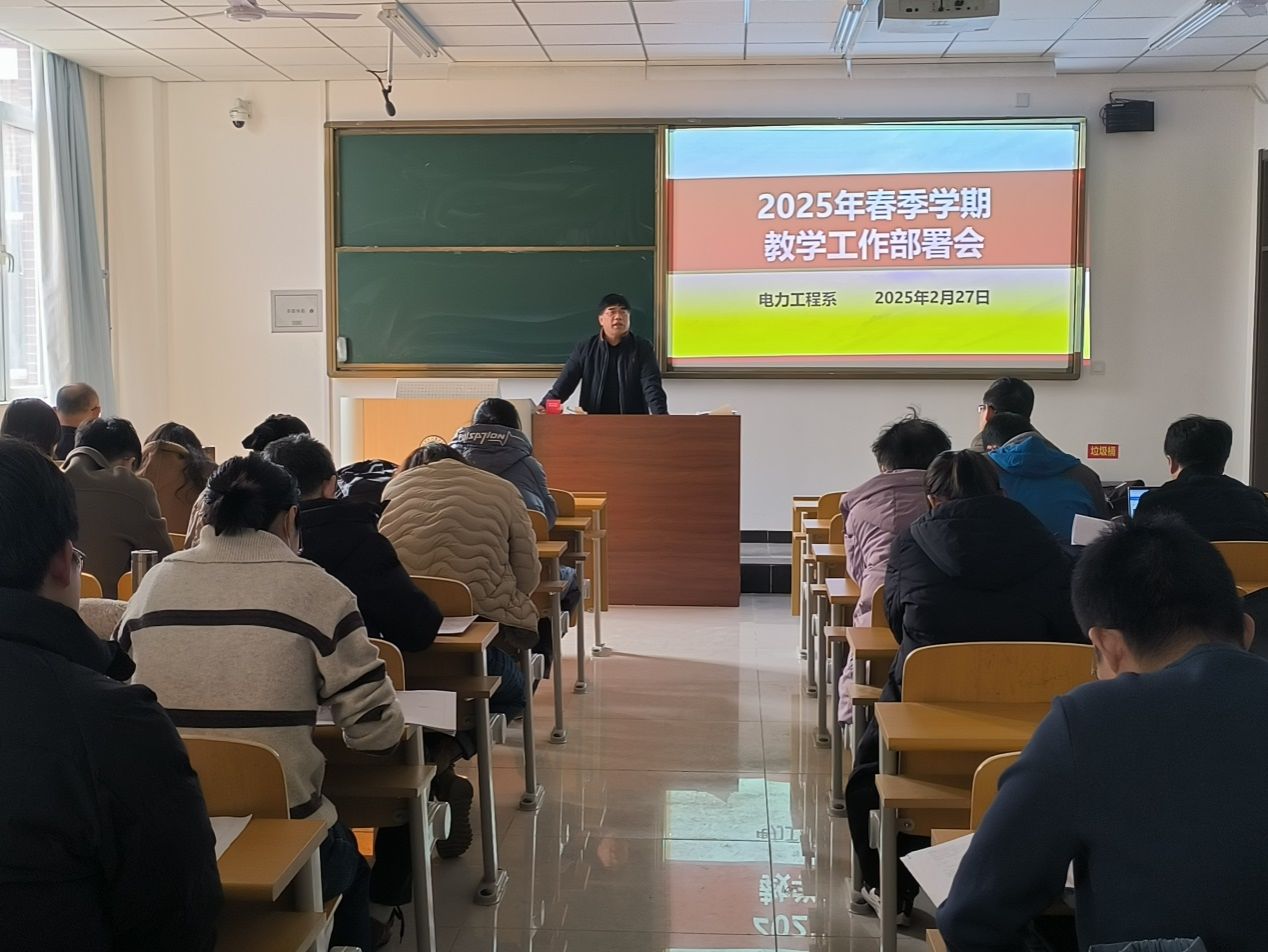 李文才传达了学校在2月26日召开的教学工作会议精神和王建明校长提出的工作要求,并根据电力工程系应用型人才培养目标和教育教学的实际情况,从课堂教学内容改革与重构、OBE教育理念贯彻与落实、数字课程建设、AI助力教育教学、基层教学组织建设、教学规范管理与提高、师德师风建设、学风建设、青年教师培养、实践教学、实验室建设与开放、科研与社会服务等方面进行深入讲解与剖析,并对每个问题都提出了明确的要求,列出本学期具体的工作任务。
