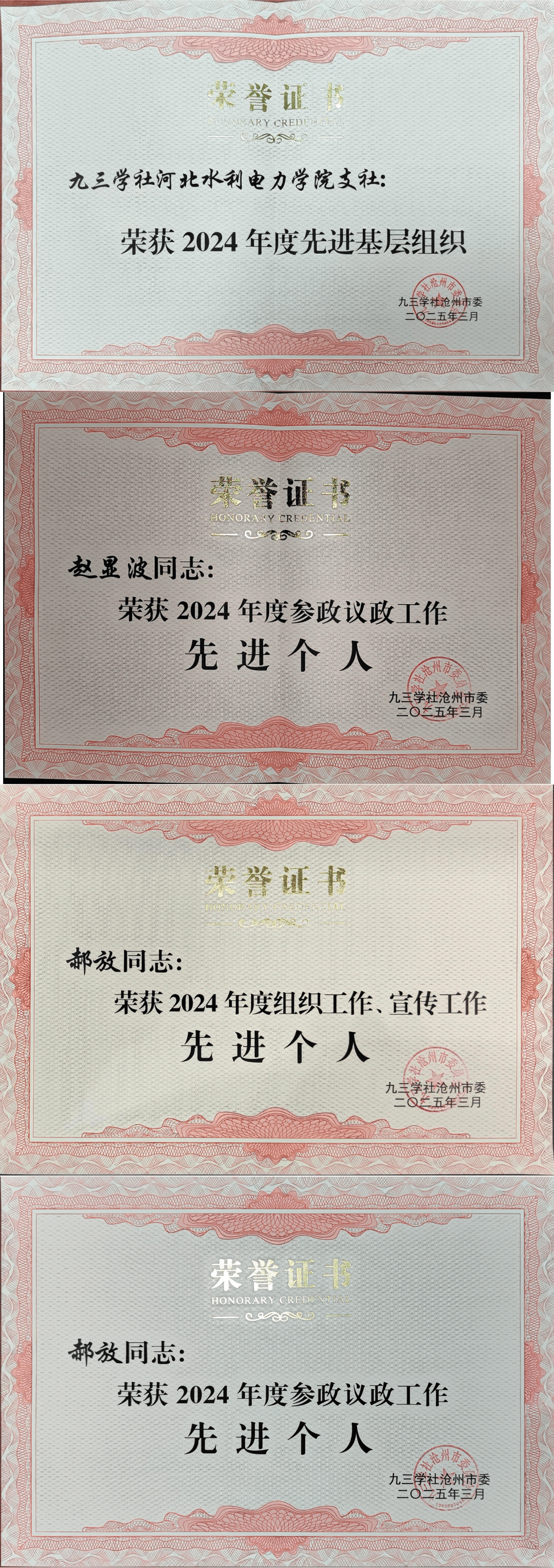 best365官网支社凭借突出的工作成效荣获“2024年度先进基层组织”称号;支社副主委郝放副教授获评“2024年度参政议政工作先进个人”“2024年度组织工作、宣传工作先进个人”;赵显波博士获评“2024年度参政议政工作先进个人”。这些荣誉的取得,既是对支社建设发展的充分肯定,更是学校党委高度重视、精心指导的成果体现。