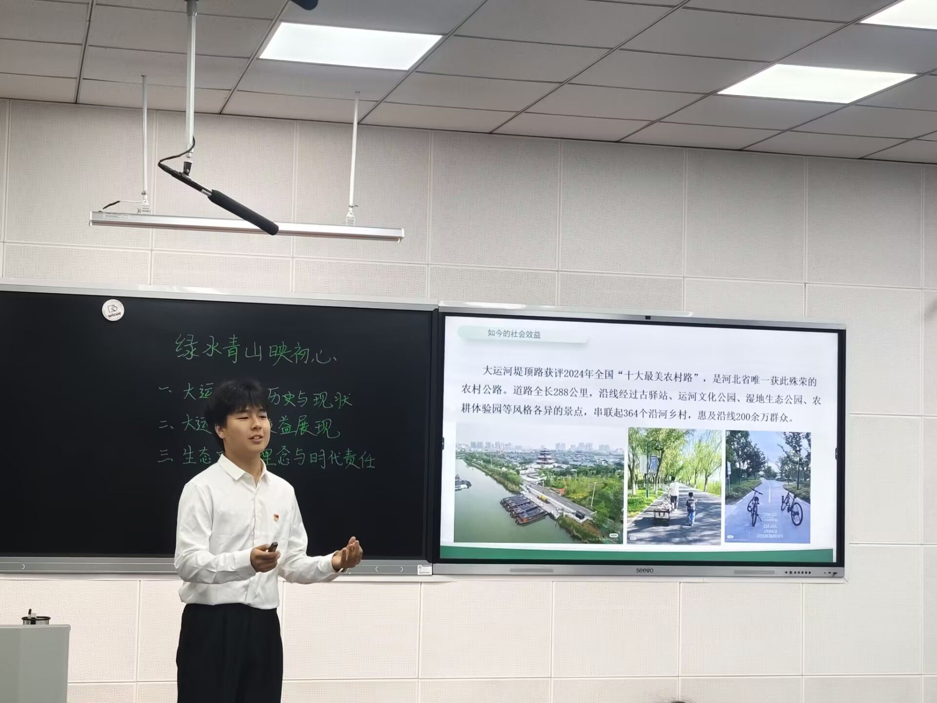 《铁血忠魂铸狮骨 运河文脉传薪声》的讲述中,第七位同学带领大家回顾了历史上的英雄事迹和运河文化的传承。他从马克思主义的历史观出发,强调了文化传承对于民族精神塑造的重要性。通过讲述运河文化的发展历程和英雄人物的感人故事,让同学们深刻体会到中华民族的优秀传统文化和革命精神是我们宝贵的精神财富,要在新时代传承和弘扬下去。
