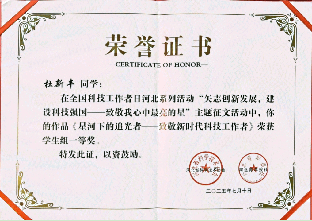 学生组同样成绩斐然,董宸宇、杜新丰两位同学分别以《创客空间的灯 点亮星辰大海》《星河下的追光者—致敬新时代科技工作者》荣获一等奖,以青春视角诠释了对科技的热爱与追求。此外,任欣乔同学获三等奖,辛伟康、靳佳朦两位同学获优秀奖。