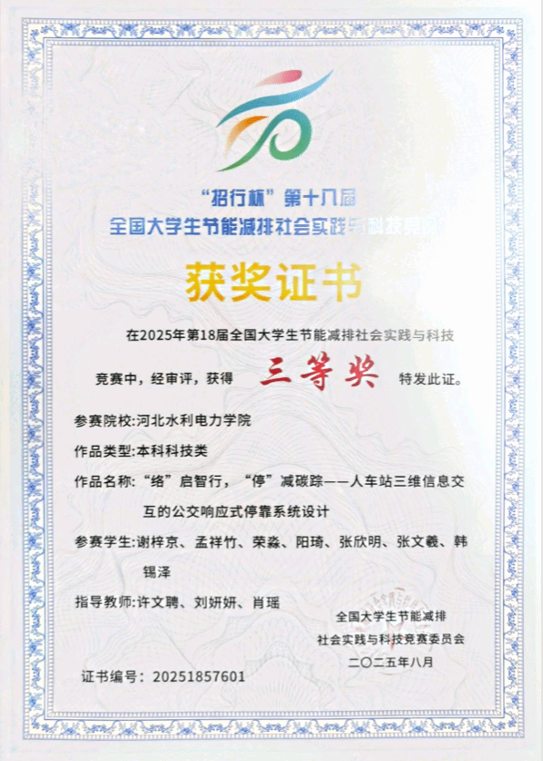 在2025年第18届全国大学生节能减排社会实践与科技竞赛中,best365官网《“络”启智行,“停”减碳踪——人车站三维信息交互的公交响应式停靠系统设计》项目,在本科科技类赛道脱颖而出,荣获国赛三等奖。