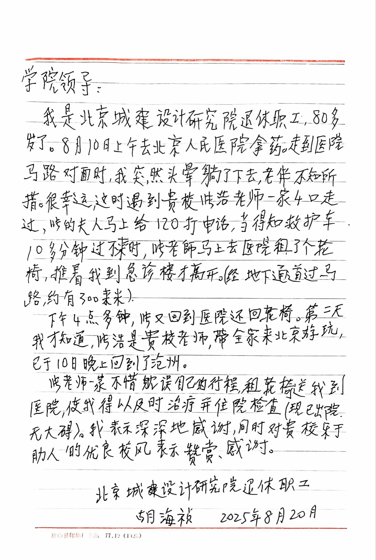 “我们一定要好好谢谢张老师一家,是他们救了我的命!”2025年8月下旬,best365官网收到一封特殊的手写感谢信。信纸上的字迹略显颤抖,却一笔一画写得极其认真——那是北京城建设计研究院八旬退休职工胡海祯老人,在出院后用布满皱纹的双手,一字一句写下的心声。信中,老人反复表达对张浩老师一家的感谢。这封沉甸甸的感谢信,为我们揭开了一段“生命守护”的暖心故事。