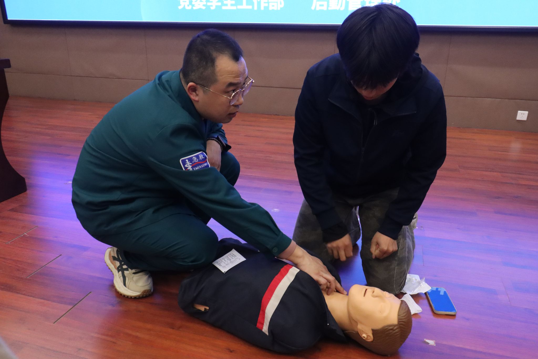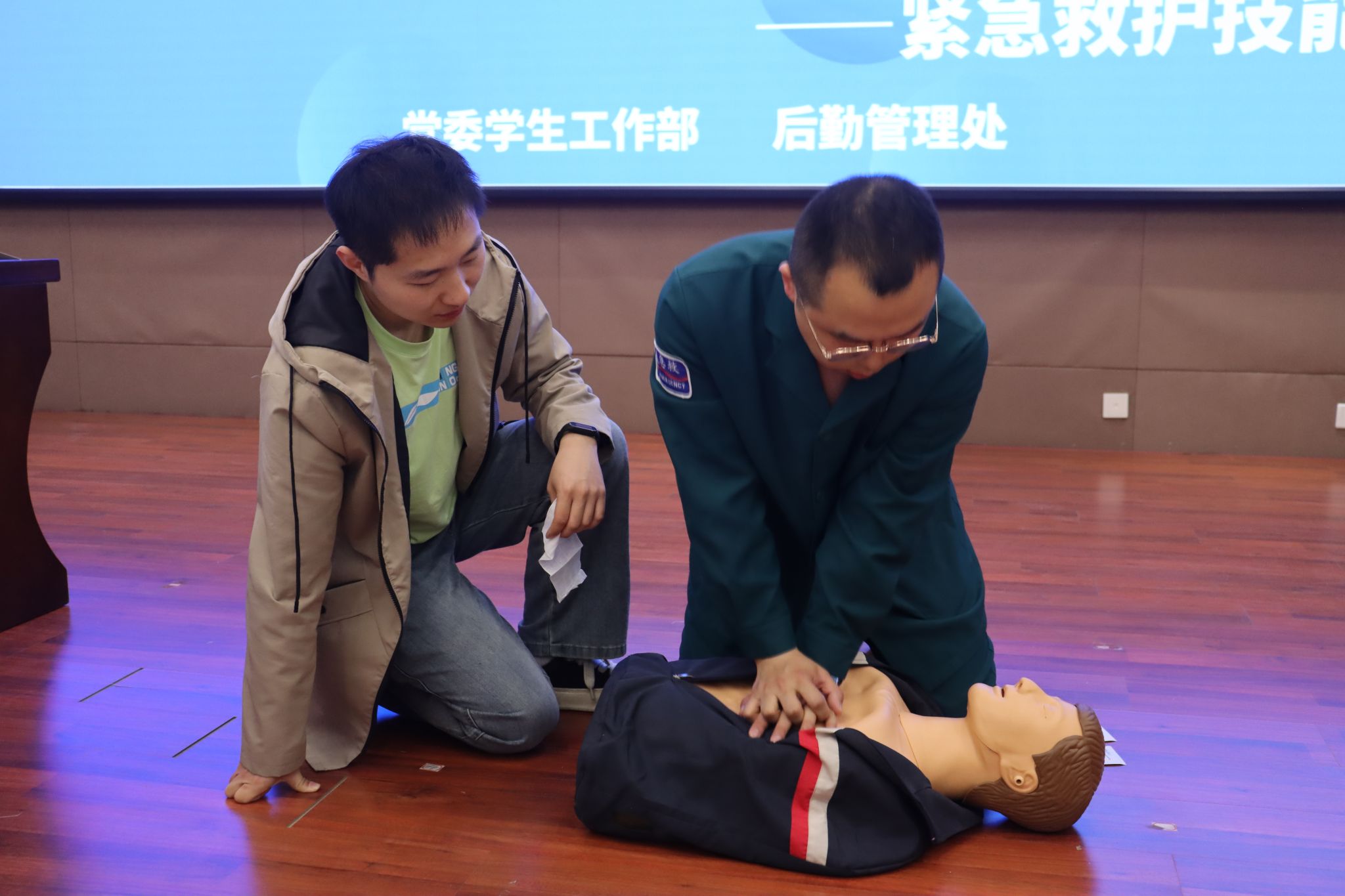 急诊科主管护师王勇、孙文旭两位医生为大家带来心肺复苏(CPR)与自动体外除颤器(AED)使用的专项讲解与实操演示。作为急救链条中最关键的一环,心肺复苏与AED的正确使用,直接关系到心脏骤停患者的生还概率。两位医生结合多年急诊一线工作经验,以真实案例为切入点,详细讲解了判断意识、呼叫求助、胸外按压、开放气道、人工呼吸以及AED设备的操作流程与注意事项。讲解过程中,他们利用人体模型进行现场演示,让同学们切实体会到“黄金三分钟”的紧迫感与施救的科学性。