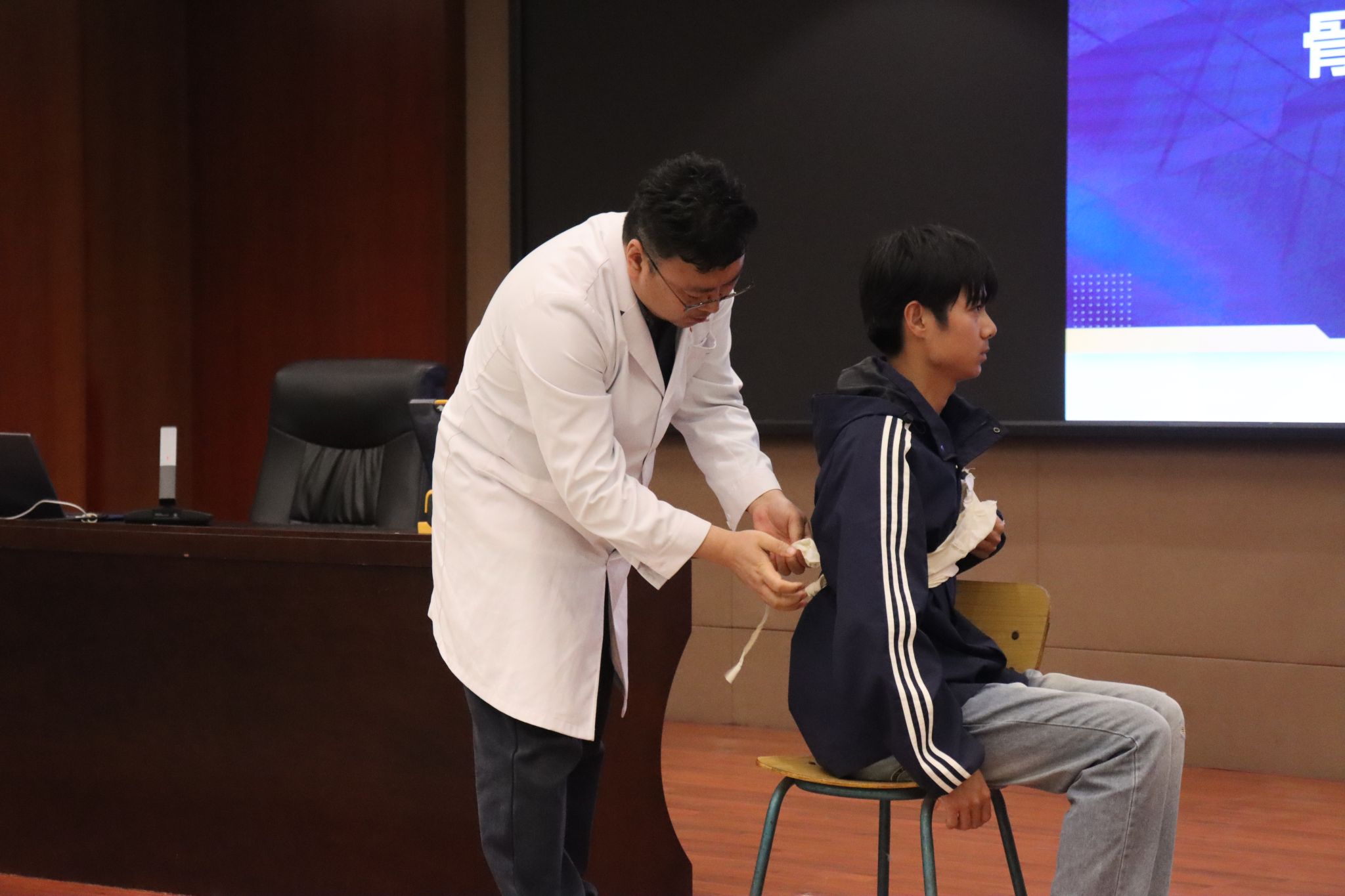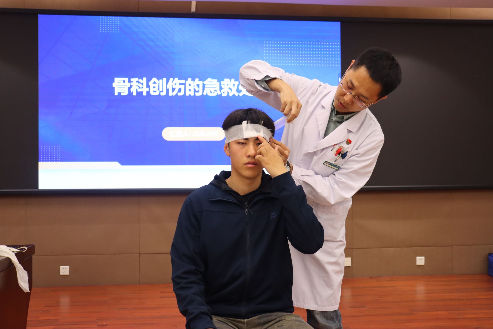 讲座伊始,神经外科王玉华副主任医师围绕“头部伤口包扎”进行了专业讲解与示范。他首先强调了在处理头部伤情时判断伤者意识的重要性,特别是对于昏迷患者,需保证其呼吸道通畅,将头部偏向一侧。随后,王医生详细演示了使用三角巾进行头部包扎的标准流程,从冲洗伤口、放置敷料,到如何正确固定、调节松紧,并反复提醒操作过程中应注意人文关怀,如向患者说明情况、询问感受等,确保施救过程安全、有效且充满温度。