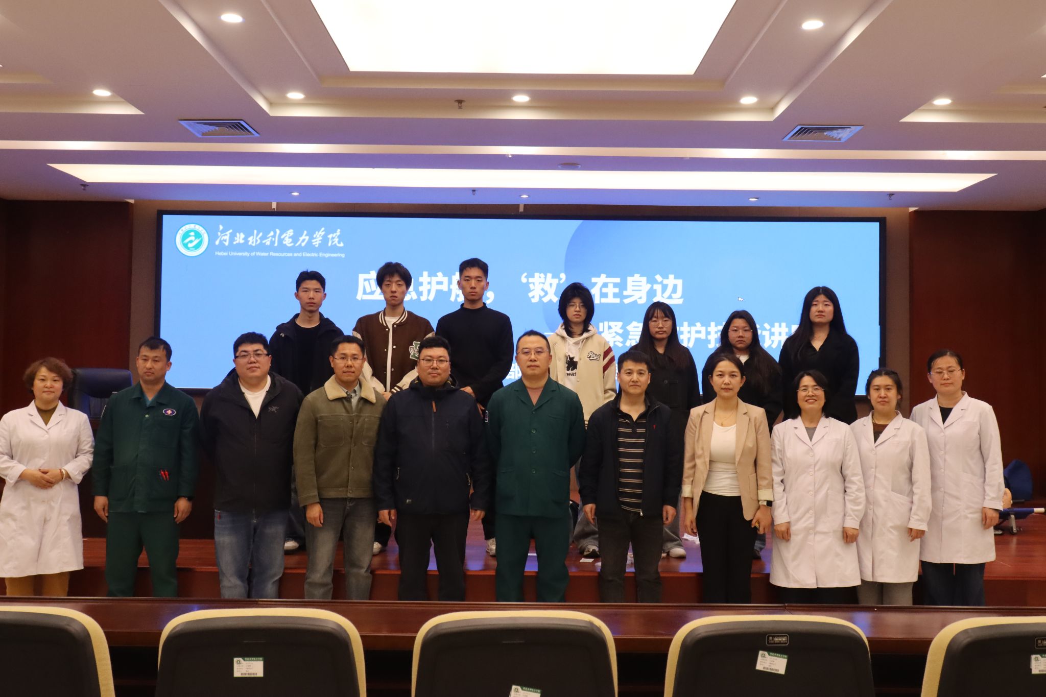 为全面提升best365官网学生的应急救护能力,筑牢校园安全防线,3月31日下午,由党委学生工作部与后勤管理处联合主办的“应急护航,‘救’在身边——紧急救护技能培训讲座”在弘文守正楼九楼报告厅举办。本次讲座特邀沧州市人民医院神经外科一区副主任医师王玉华、胸外科副主任医师张银文、关节运医骨科三区主治医师赵吉堂、急诊科主管护师王勇及孙文旭组成专家团队,进行现场授课与指导。后勤管理处校医务室医生共同参与,全校200余名学生参加活动。