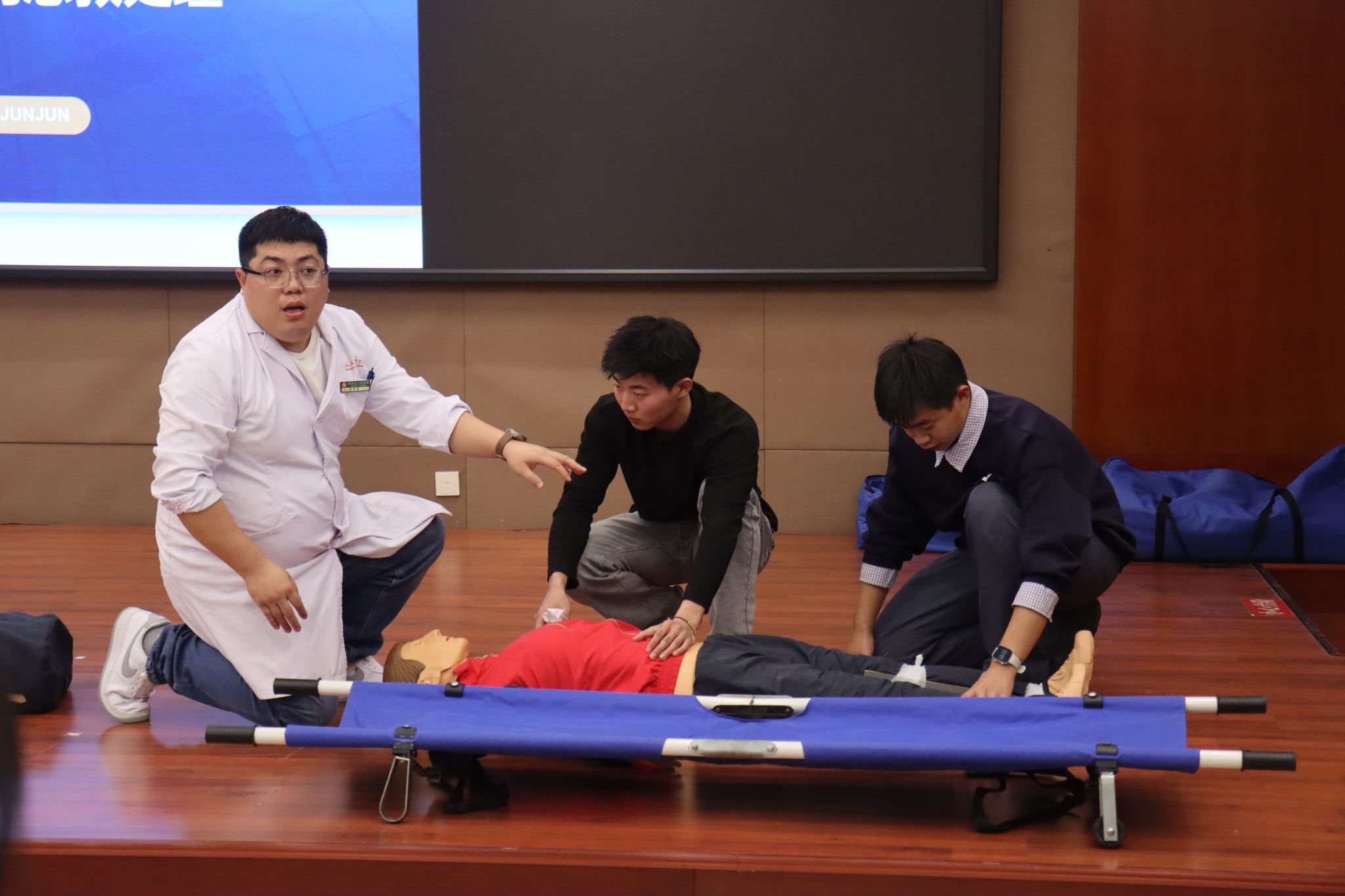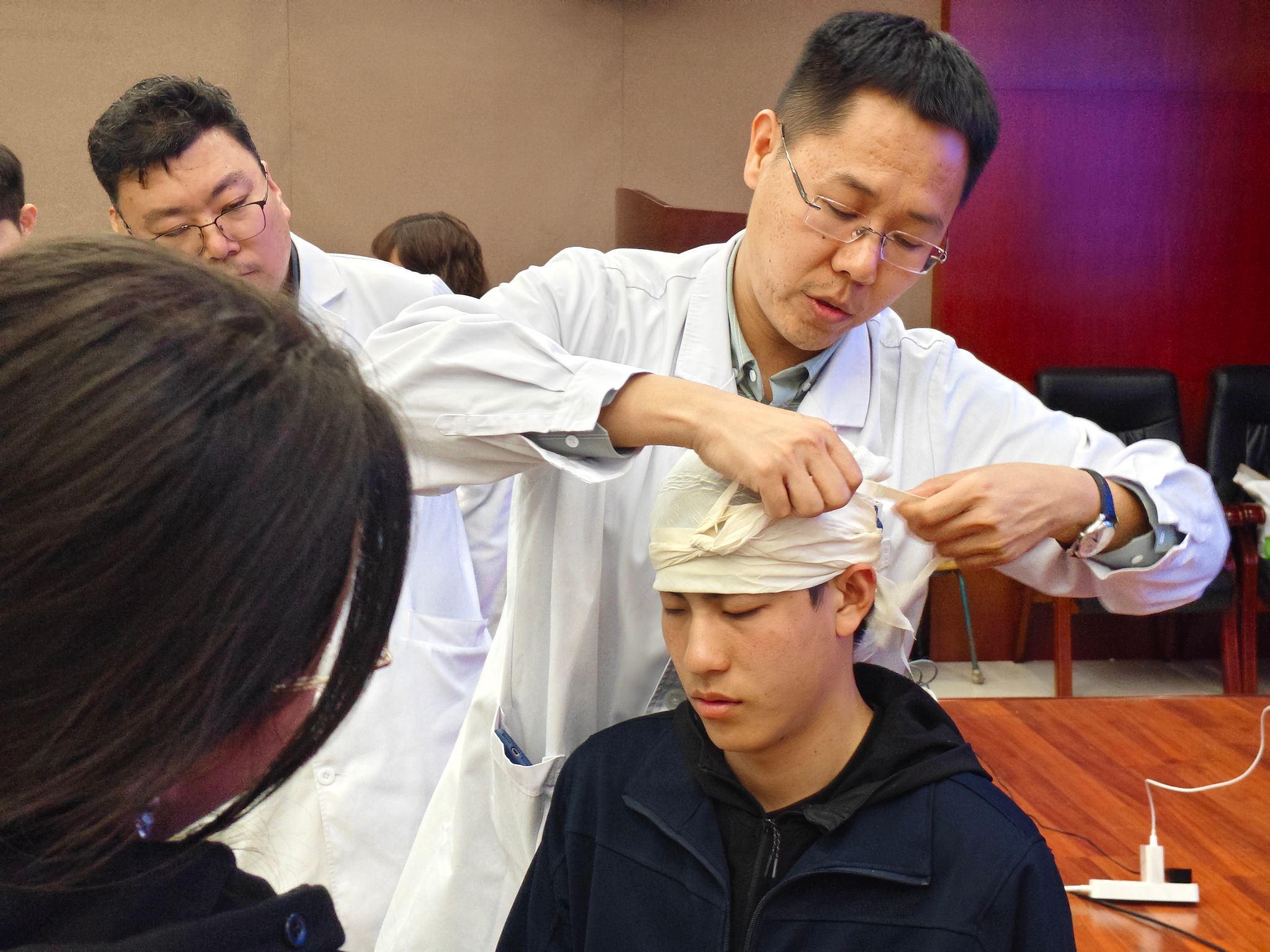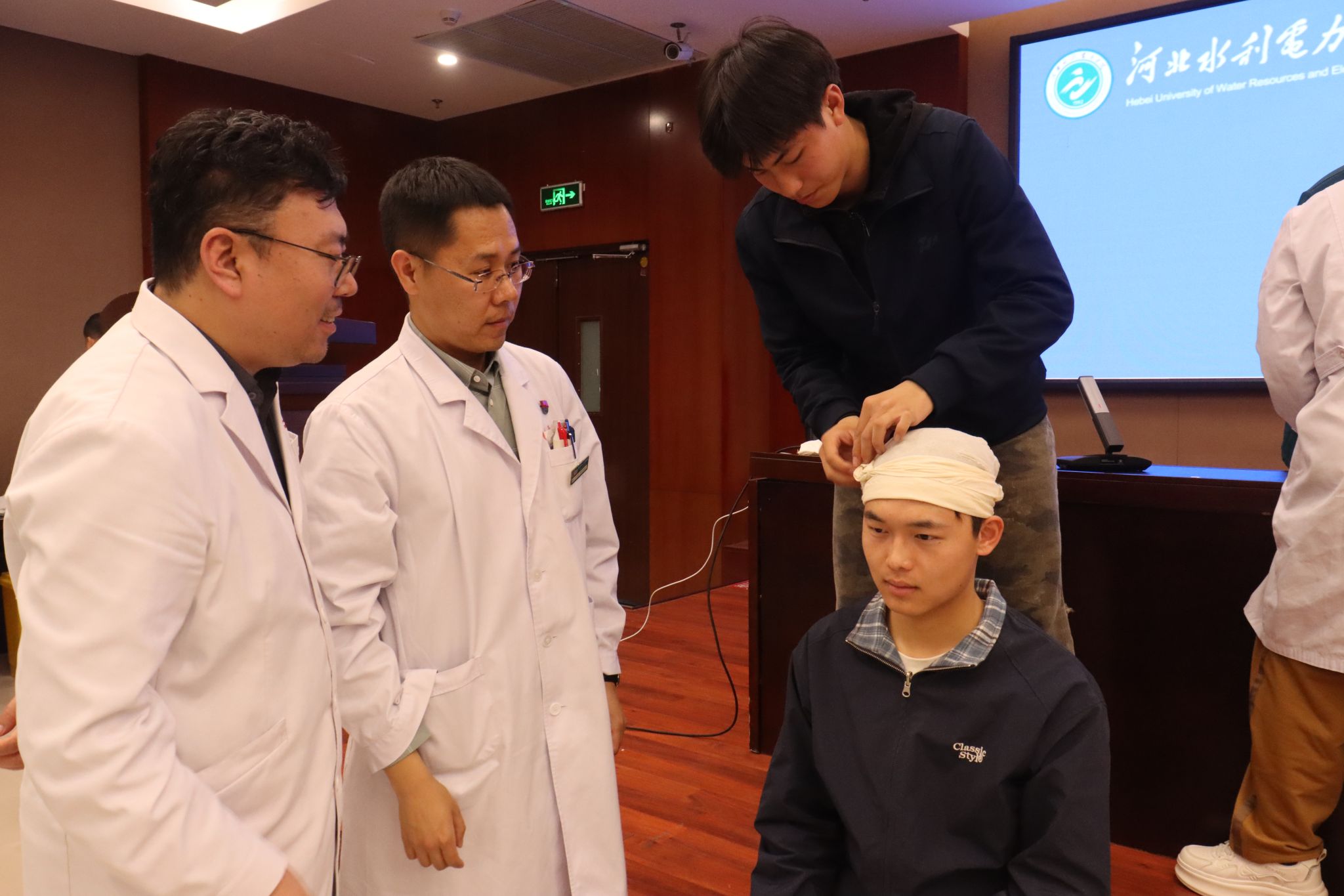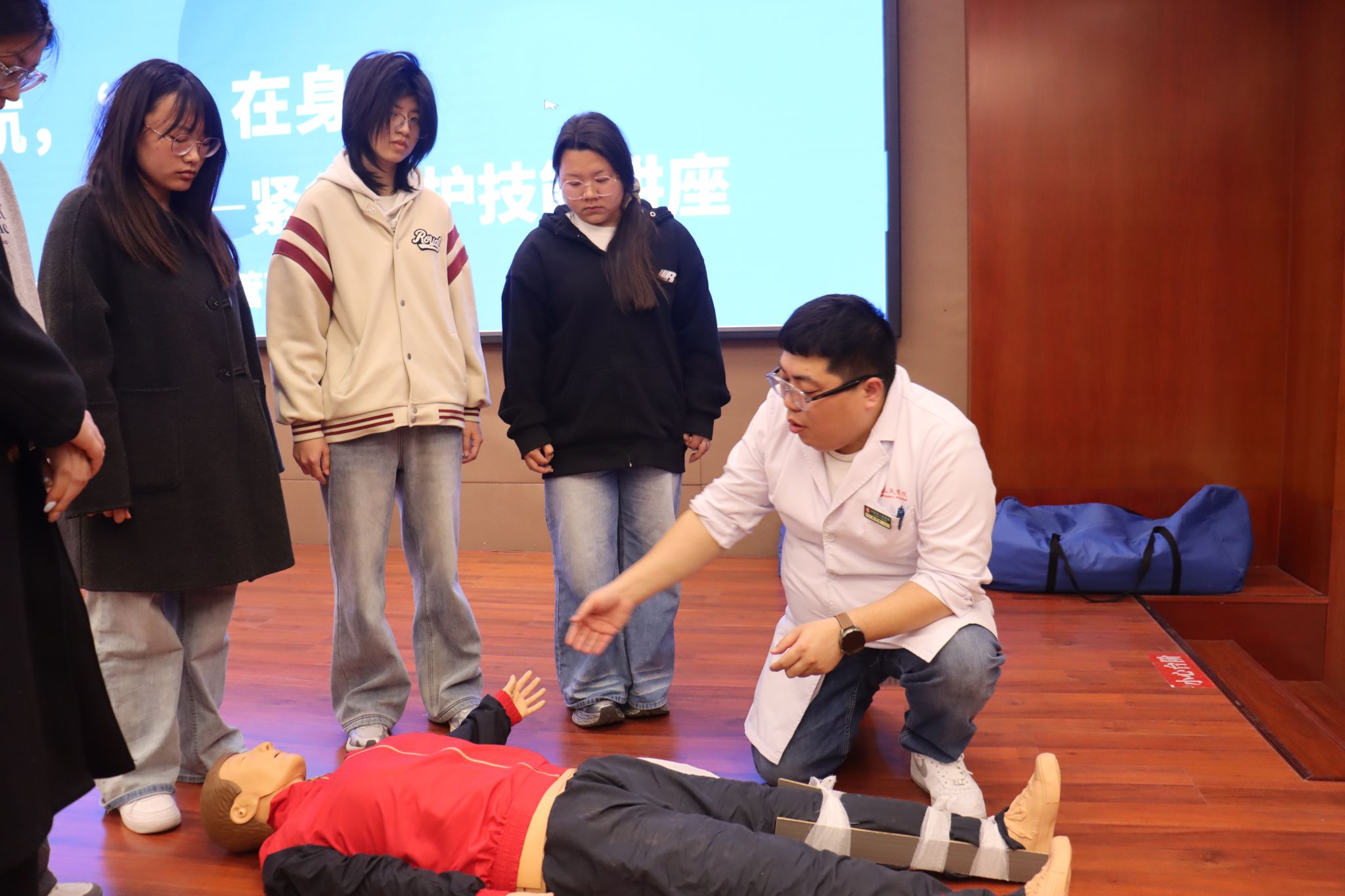 理论讲解与演示环节结束后,医生们深入学生中间,开展一对一指导。同学们踊跃上前,在医生们的耐心指导下,依次进行头部包扎、胸部固定、小腿骨折包扎以及心肺复苏等项目的实际操作练习。医生们仔细观察每一位同学的操作细节,从按压的力度、频率,到包扎的松紧度、敷料的放置位置,逐一进行纠正与示范,并反复强调操作过程中的人文关怀与规范流程。面对同学们提出的各种问题,医生们也结合自身丰富的临床经验,给予耐心细致的解答。