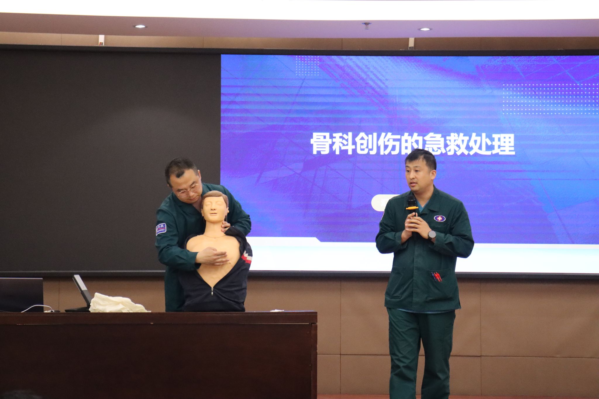关节外科赵吉堂主治医师针对“小腿骨折固定”进行了讲解与实操。他通过模拟在山区环境下的急救场景,指导学生在缺乏专业设备的情况下,利用有限工具进行有效固定。赵医生详细演示了从判断伤情、检查神经血管功能,到选择夹板、超过关节固定,再到使用棉垫保护骨骼凸起处、包扎固定的完整流程。他还特别提到在特殊情况下,如何利用“健肢固定”的方法进行搬运,并再次强调了操作前后反复评估伤者神经血管状态的重要性。