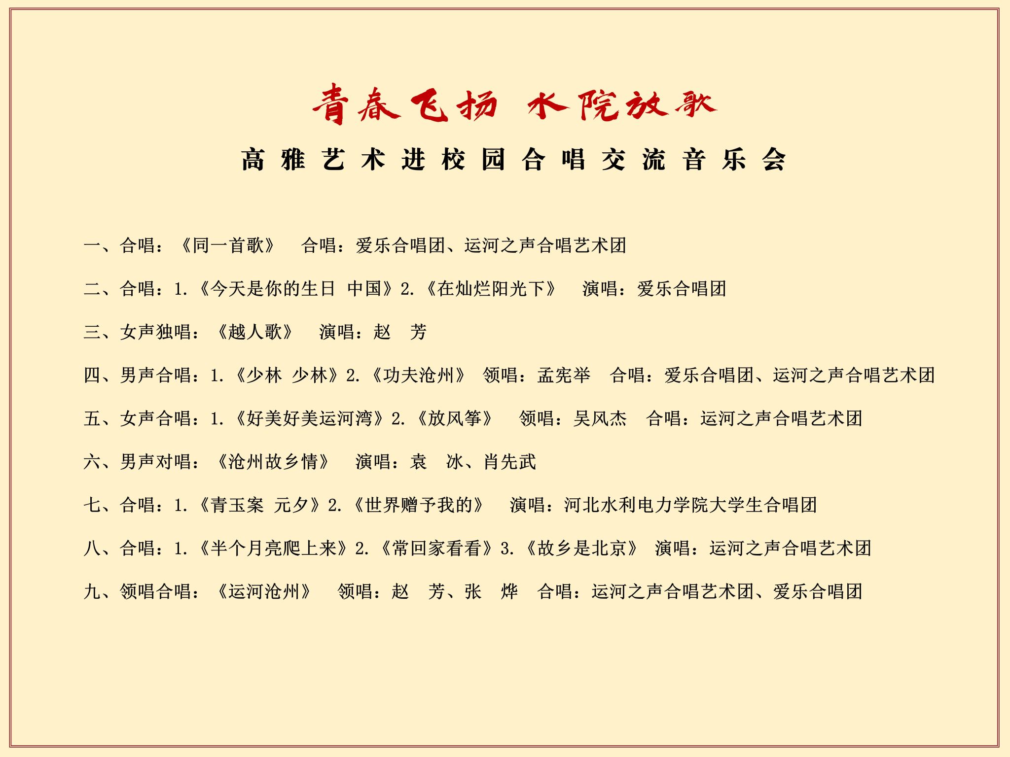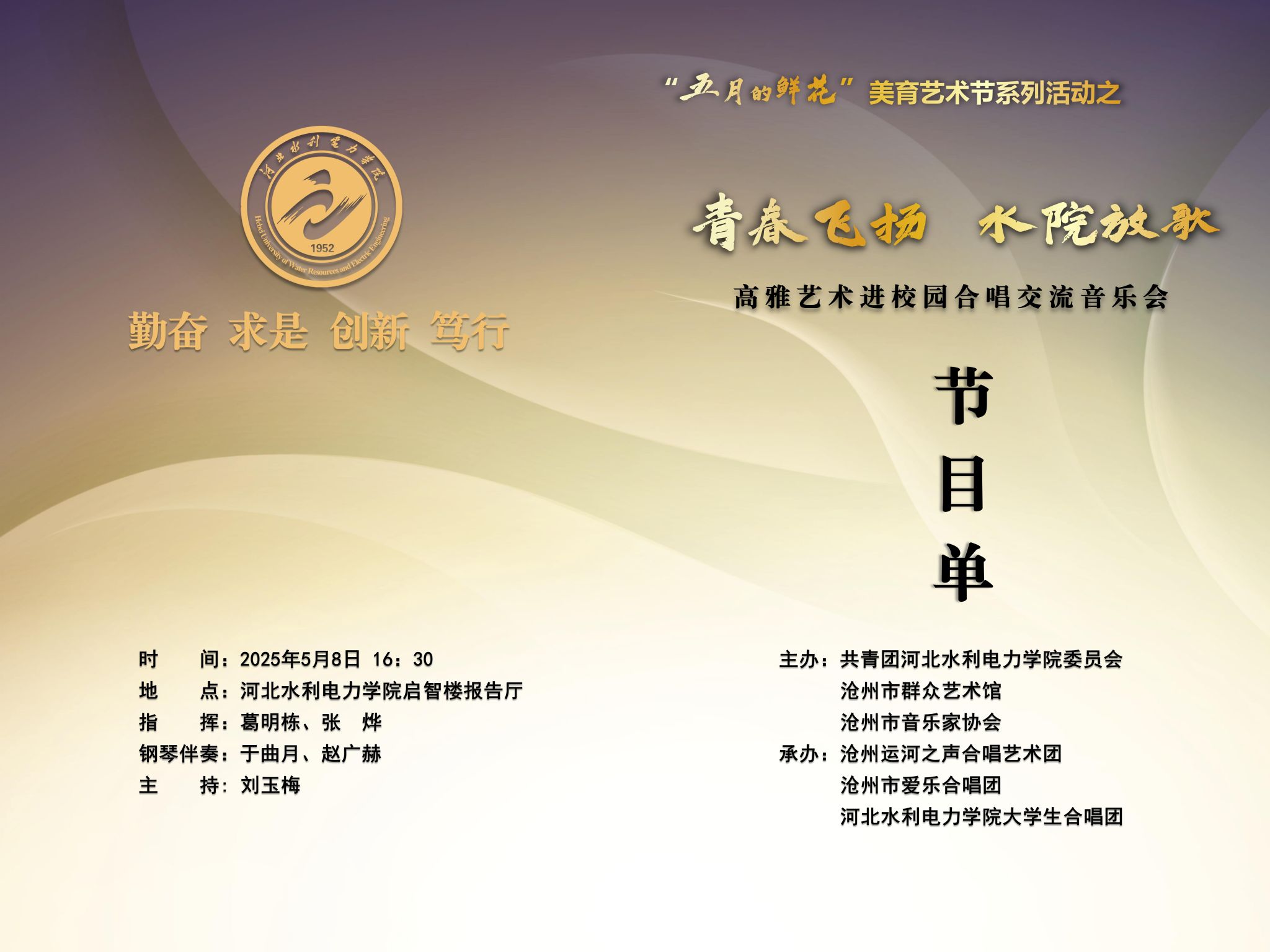 为深入学习贯彻党的二十大精神,进一步加强best365官网美育工作,创建美育特色品牌,全面提升校园文化建设水平,校团委联合沧州市群众艺术馆、沧州市音乐家协会等单位,举办“五月的鲜花”美育艺术节系列活动,包括合唱交流音乐会、红歌展演、书画展览、舞蹈赏析、美育讲座等内容。现将首场演出——校园合唱交流音乐会演出节目单通知如下,欢迎广大师生踊跃参加。